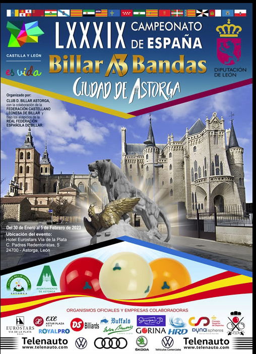 Desde el pasado sábado se disputa en la ciudad leonesa de Astorga la LXXXIX edición del campeonato de España de Tres Bandas con 171 jugadores, la participación más alta en la historia de los campeonatos de España en la modalidad. Hay que remontarse a la edición de 1987 (Barcelona) para encontrar una cifra de participantes casi tan alta como la de este año (168). La cuestión es que el alto números de participantes ha provocado que sean nueve los días de torneo en lugar de los siete habituales. Desde el pasado sábado 28 de enero las bolas comenzaron a rodar y no pararán hasta el domingo 5 de febrero.
