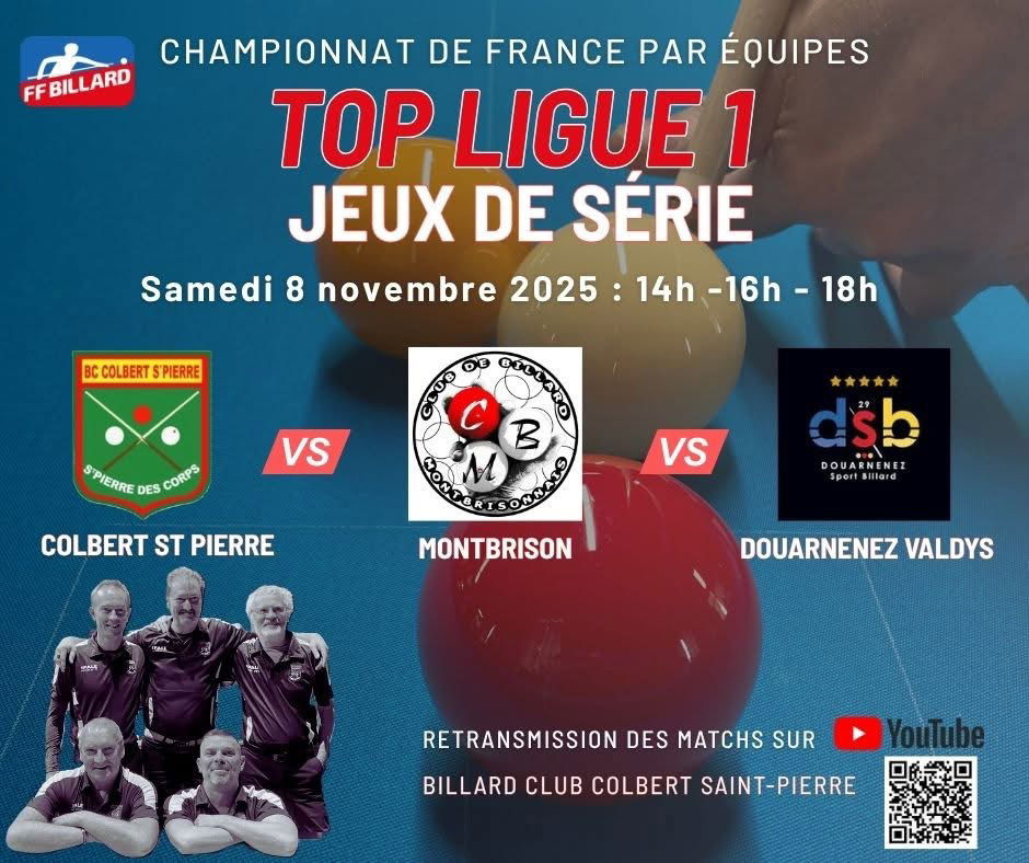 La deuxième journée de la Top Ligue 1 aux jeux de séries occupera l’actualité nationale le week-end prochain. Dans le groupe A, Saint-Pierre-des-Corps recevra Montbrison et Douarnenez Valdys (Andernos exempt), dans le groupe B, Intermarché recevra Bernay et Oissel (Chartres 1 exempt), dans le groupe C, Chartres 2 recevra Soissons et Douai-Carvin (Ronchin exempt). Ces compétitions se joueront principalement le samedi et se termineront parfois le dimanche notamment à Andernos.