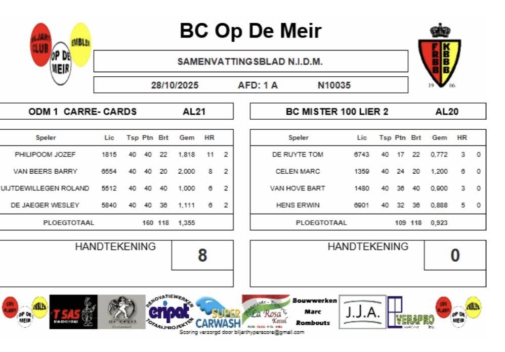 Le choc entre Op de Meir et Biljart Express n’a pas connu de vainqueur. Jef Philipoom et Barry Van Beers pour les locaux se sont inclinés contre Eddy Merckx et Frans Van Kuyk 33-40 en 30 et 32-40 en 27. Roland Uijtdewillegen et Wesley de Jaeger s’était imposés face à Gerwin Valentijn et Martin Spoormans à 1,739 et 1,600.