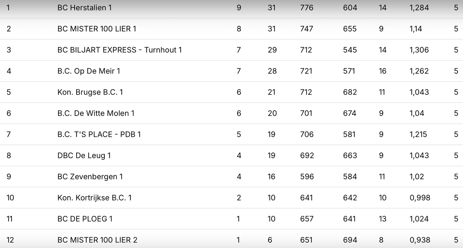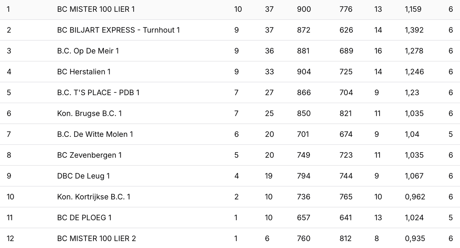 Pour la 6ème journée disputée cette semaine, Biljart Express explose les compteurs en gagnant 8-0 à la maison face à De Leug et une moyenne d’équipe de 1,975 (160 en 81 reprises) !!! Le leader Eddy Merckx bat Jeffrey Jorissen 40-29 en 13 reprises (3,076/2,230). Frans Van Kuyk bat Davy Van Havere 40-15 en 14 reprises (2,857), Gerwin Valentijn bat Andy de Bondt 40-26 en 22 reprises et Guy Van Litsenborg bat Mik Durwael 40-32 en 32. Biljart Express passe de 1,300 à 1,400 sur son début de saison d'une semaine à l'autre !!