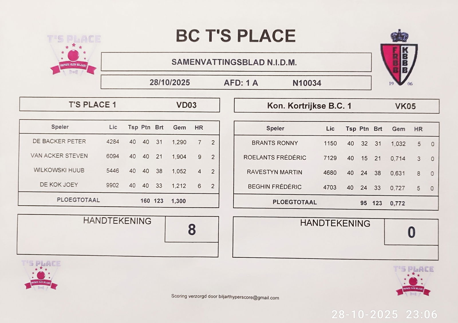 Mister 100 n°1 s’était imposé à la maison face à T’s Place 6-2 avec, pour seule défaite, celle de son leader Peter Ceulemans battu par Peter de Backer 40-36 en 36. Jerry Hermans avait disputé le meilleur match à 1,904 contre Huub Wilkowski et Kurt et Bart Ceulemans avaient dominé Steven Van Acker et Joey de Kok à 1,250 et 1,176.