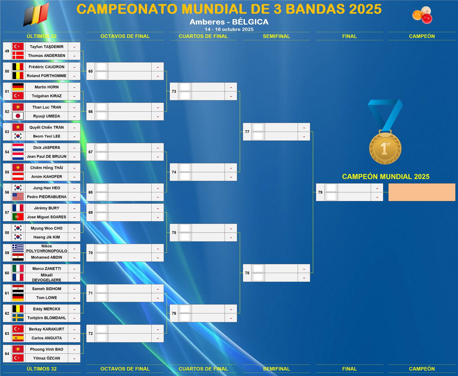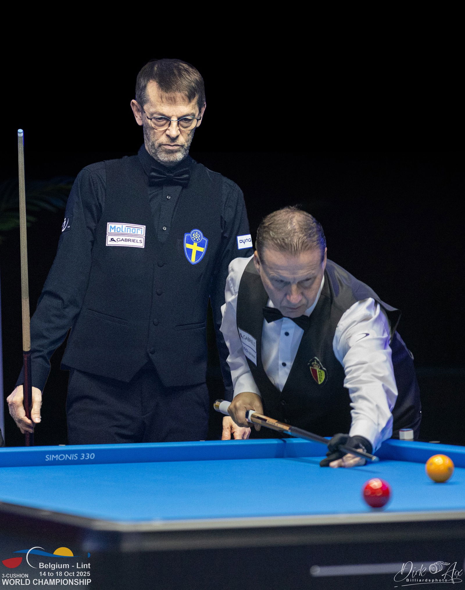 Eddy Merckx remporte un choc de titans face à Torbjörn Blomdahl. A 36-32 à la 20ème, le Belge enchaine 1-6-7 pour clore le match 50-34 en 23/22 reprises. Berkay Karakurt complète le succès des têtes de séries en prenant le dessus sur Carlos Anguita 50-35 en 26/25 reprises.