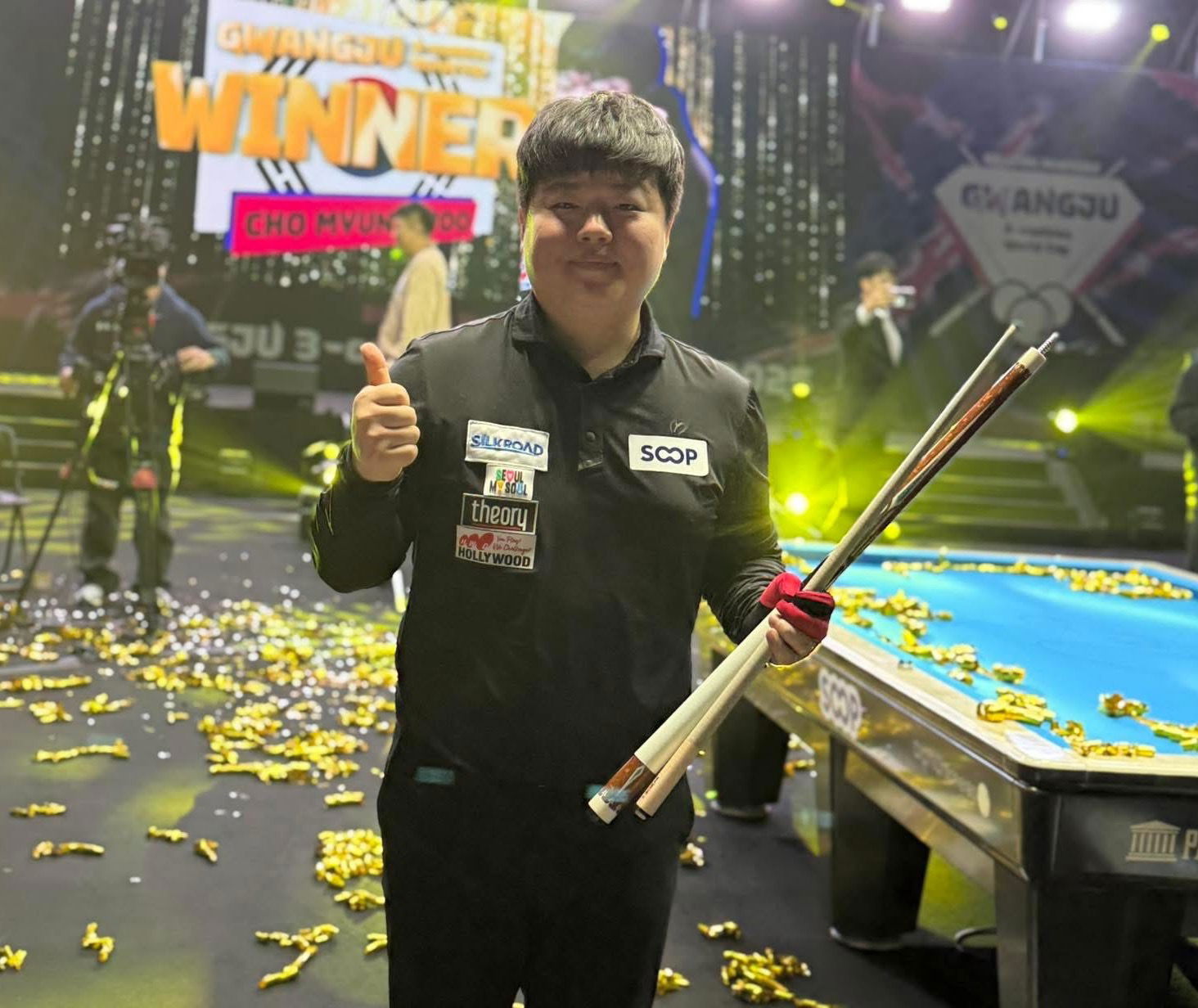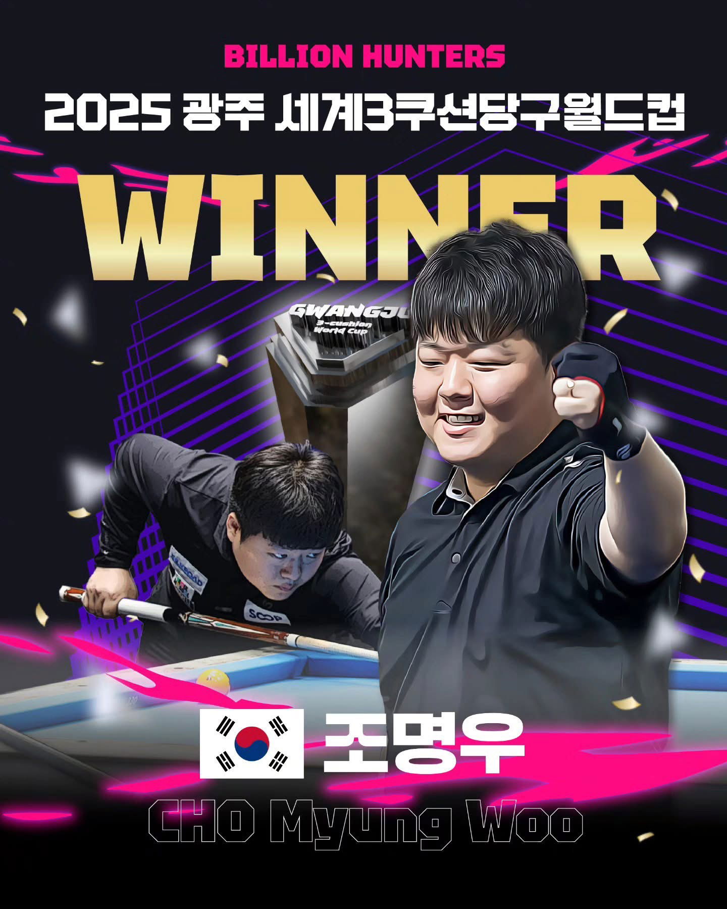 Une pluie de confettis dorés est venue célébrer l’enfant chéri de Corée du Sud ce dimanche 9 novembre 2025 à Gwangju ! Le même jour où Wu Yize (22 ans) battait John Higgins (50 ans) en finale du Tournoi International de snooker en Chine, Myung-woo Cho (27 ans) remporte sa 3ème World Cup après Sharm el Sheikh 2022 et Porto 2025. C’était la 6ème finale de sa jeune carrière. Son adversaire, Marco Zanetti, 63 ans, jouait sa 16ème finale de World Cup pour 5 victoires.