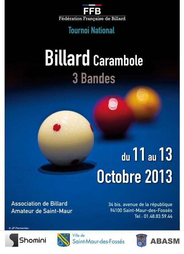 Adresse de la compétition : Association de Billard amateur de Saint-Maur – 34 bis, Avenue de la République – 94100 Saint-Maur-des-Fossés – Tel : 01.48.83.59.44