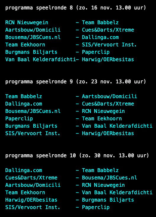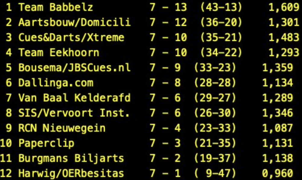 Enfin Van Baal Kelderafd gagne 7-1 en déplacement à Paperclip. Roland Forhomme bat Dick Jaspers 40-39 en 28, Sergio Jimenez bat Cédric Melnytschenko 40-17 en 20 reprises, Thorsten Frings bat Dan Breur 40-26 en 37 et Sam van Etten et Anno de Kleine partagent les points en 30 coups.