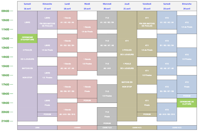 Bref, du beau spectacle en perspective, avec une organisation qui s'est mise à la hauteur de l'événement, 4 billards Breton Aero neufs, de nouveaux éclairages, sono, estrades rénovées... Seul bémol, il n'y aura pas de retransmission internet, mais vous pourrez suivre les résultats qui seront renseignés au fur et à mesure des rencontres, par notre directeur de jeu Fabrice Bellens, sur le site FFB mais également sur le site Kozoom, forum jeux de série.
