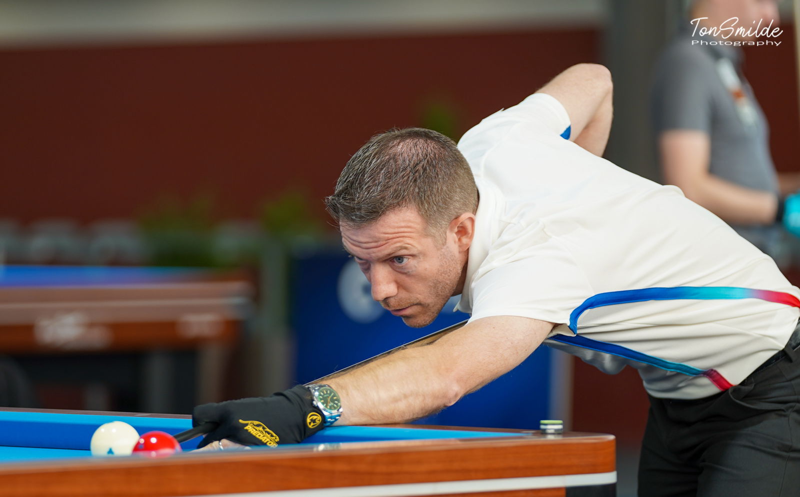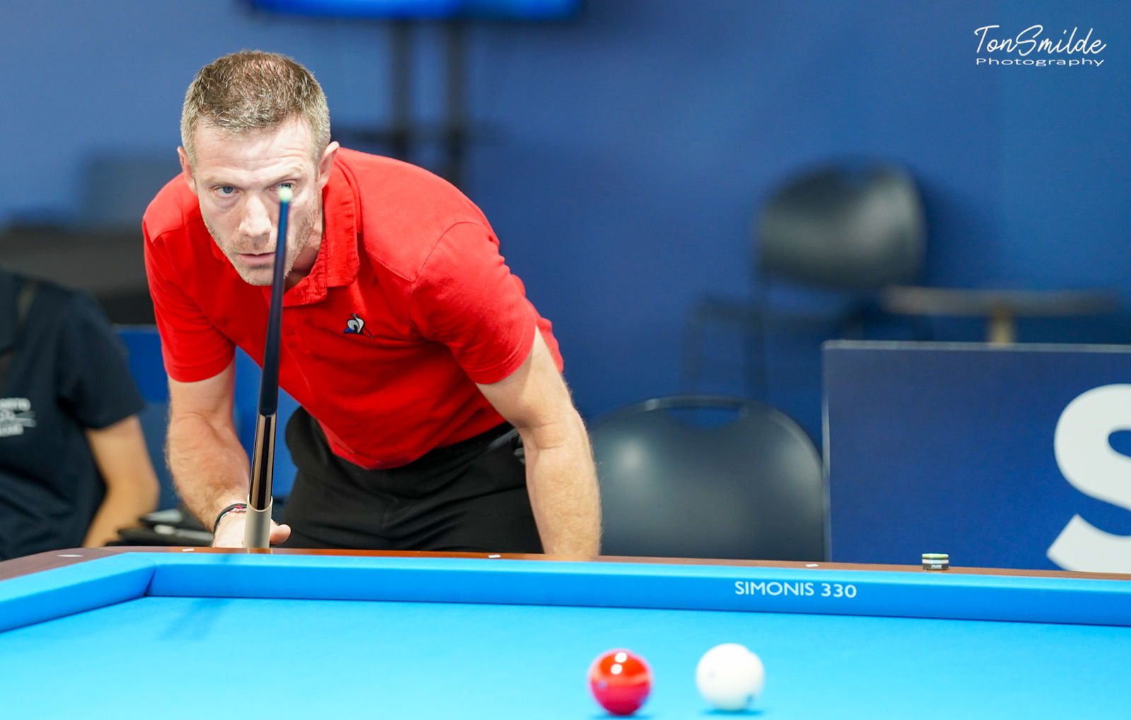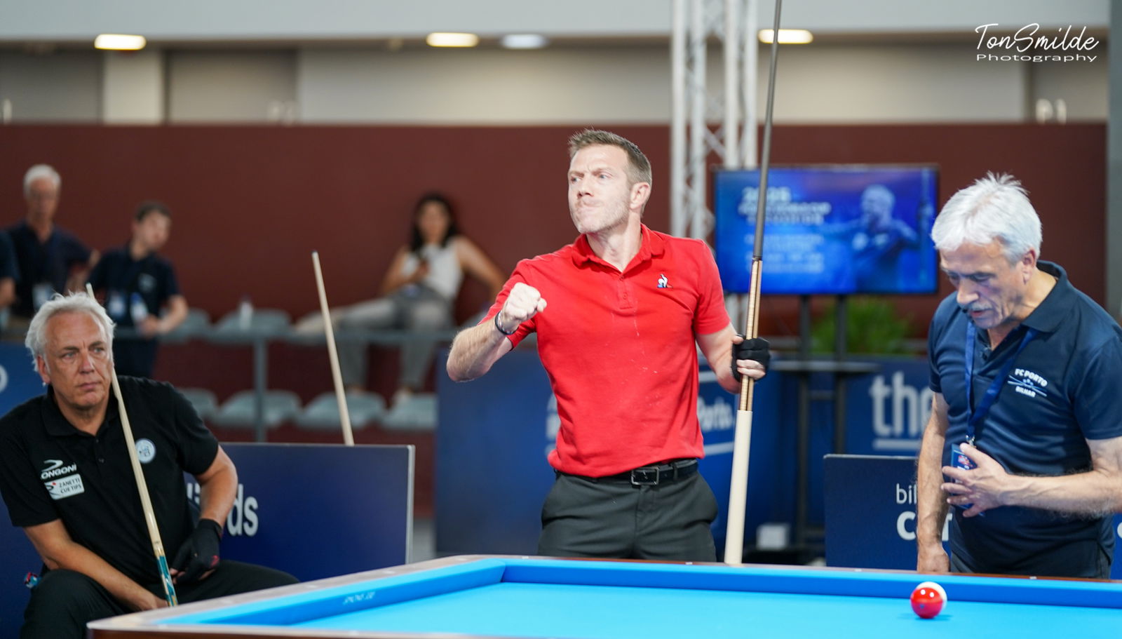 La journée de vendredi de Jérémy Bury est exceptionnelle avec ce huitième de finale face à Haeng-jik Kim. Bury commence par 3-2-4-2-7-9 pour mener à la pause 27-16 en 6 reprises. Une série de 10 à la 9ème reprise porte son avantage à 38-17 en 9/8 reprises ! Cette série de 10 du Français décuple la précision du joueur coréen qui enchaine immédiatement 4-6-8-7 de la 8ème à la 11ème reprise et le score est alors de 43-42 en 12 reprises !! Jérémy Bury réplique illico par 6 pour mener 49-42 en 13 reprises puis il finira deux reprises plus tard 50-44 en 15/14 reprises. Haeng-jik Kim s’incline à 3,147 de moyenne face aux 3,333 du Français.
