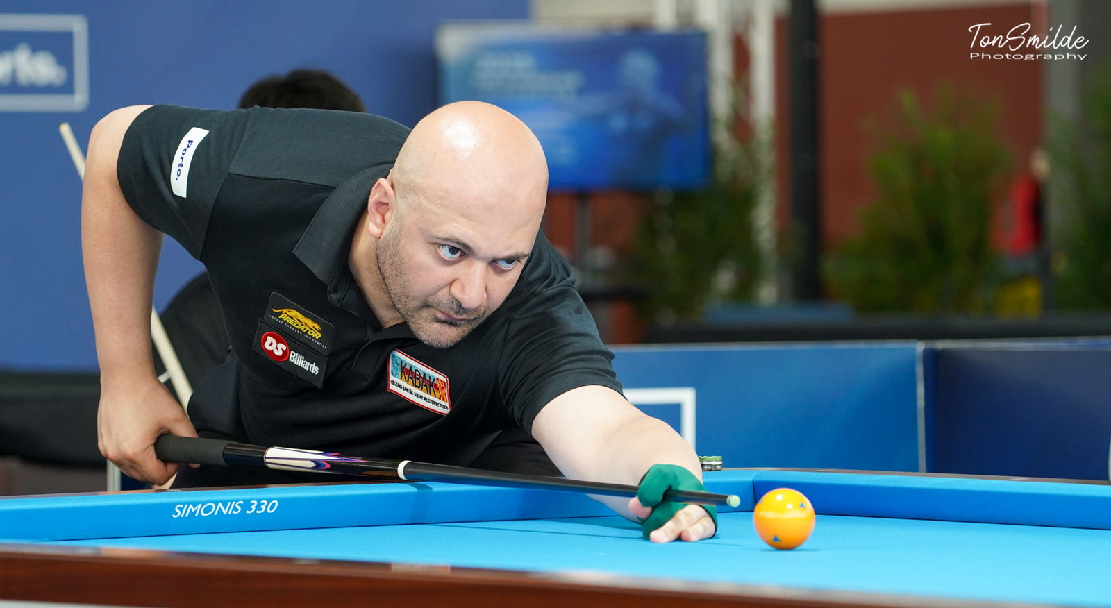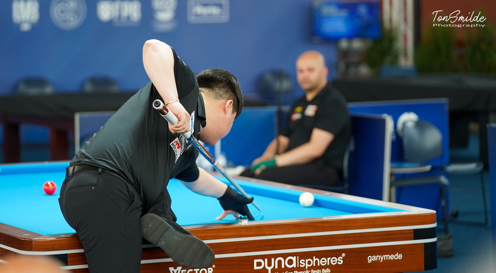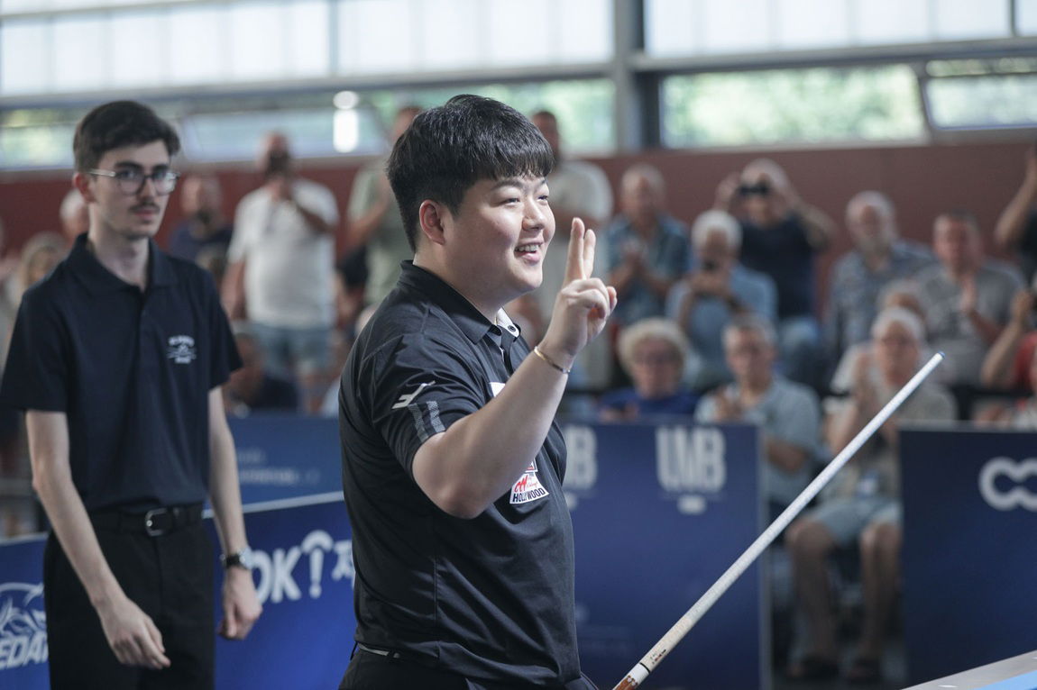 Le jeune prodige coréen Cho a pris le pouvoir dans une chaleur torride (38 degrés dans la salle) poussant les organismes à rude épreuve. Score final 50-34 en 23 reprises après l’enchainement 5-5-3-8 de la 17ème à la 20ème reprise transformant un 28-24 en 16 en un 49-31 en 20 et après avoir manqué trois billes de match.