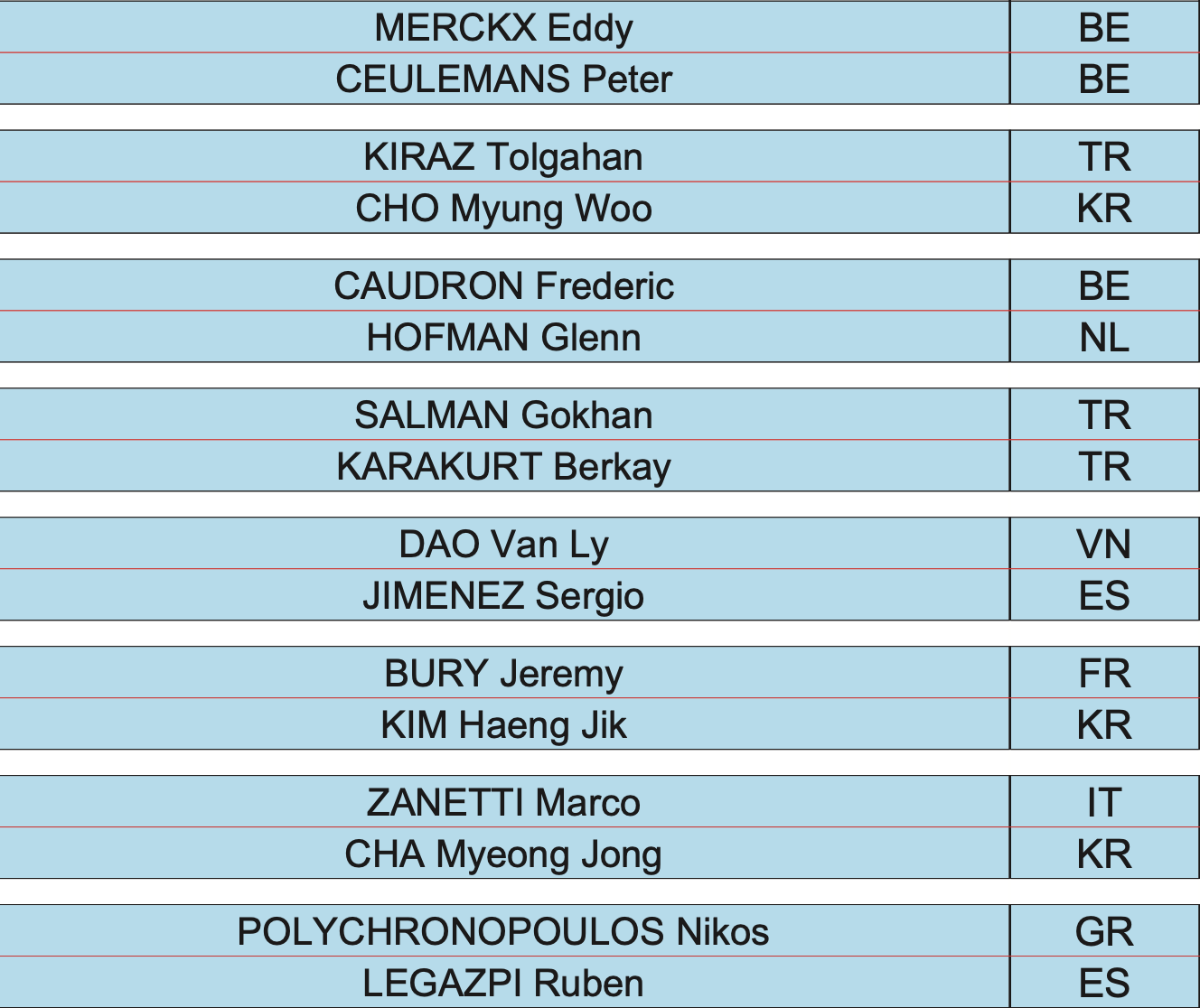 Dans le groupe F, Marco Zanetti (1,591) et Glenn Hofman (1,500) affichent 4 points chacun et se qualifient. Jung-han Heo et Ömer Karakurt sont éliminés.