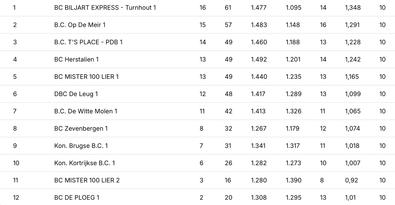 A l’issue de la 10ème journée de championnat de Belgique 3B par équipe, Biljart Express s’installe seul en tête avec 16 points suite à sa victoire à domicile face à Courtrai profitant du match nul d’Op de Meir à Mister 100 n°1. Op de Meir est à un point du leader, T’s Place à deux points après sa victoire à Mister 100 n°2. Herstalien prend des points importants à Bruges après sa courte victoire et pointe désormais à la 4ème place à égalité avec Mister 100 n°1 à 3 unités du leader.