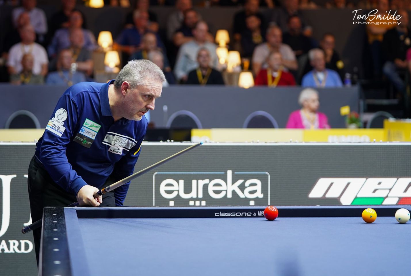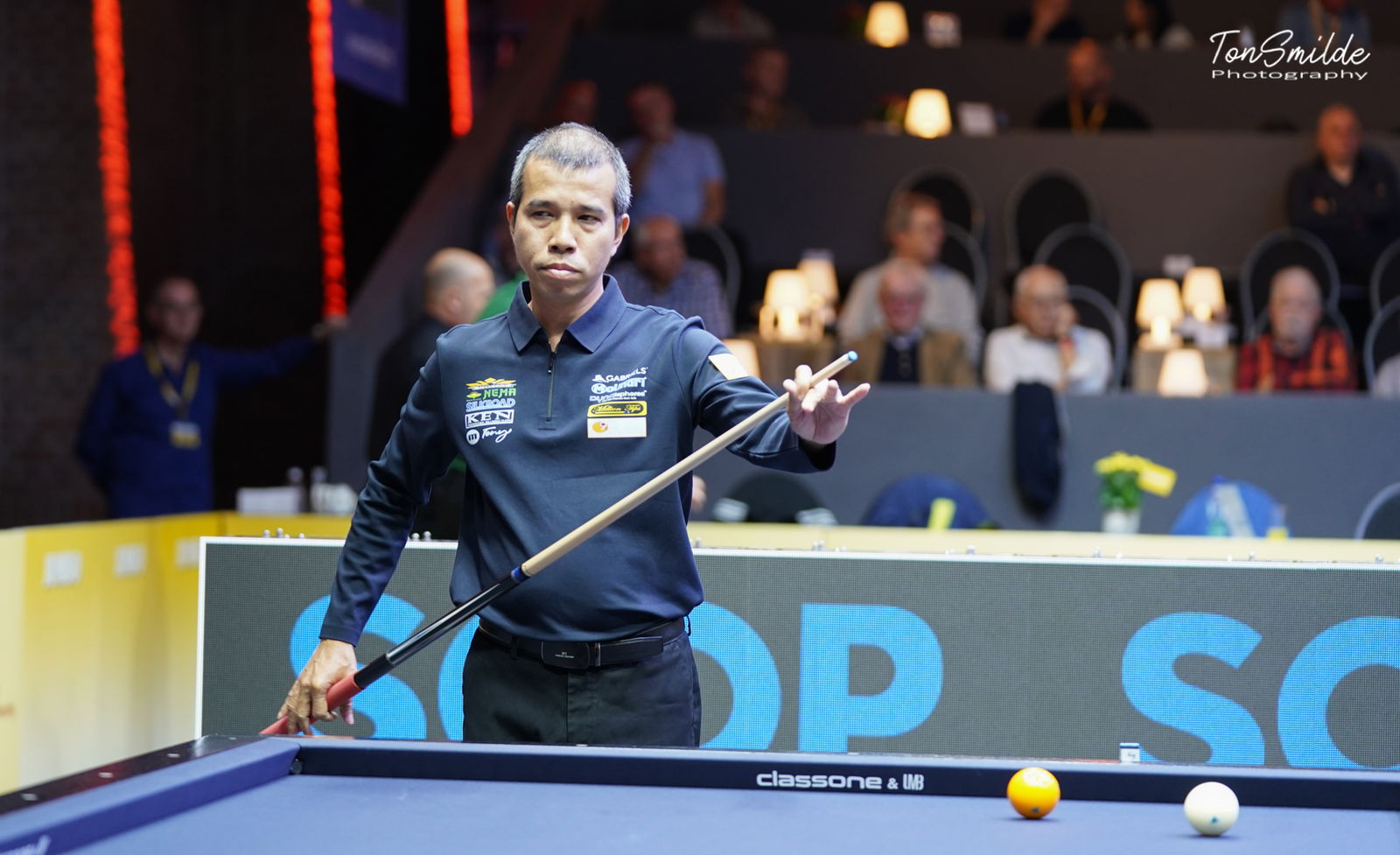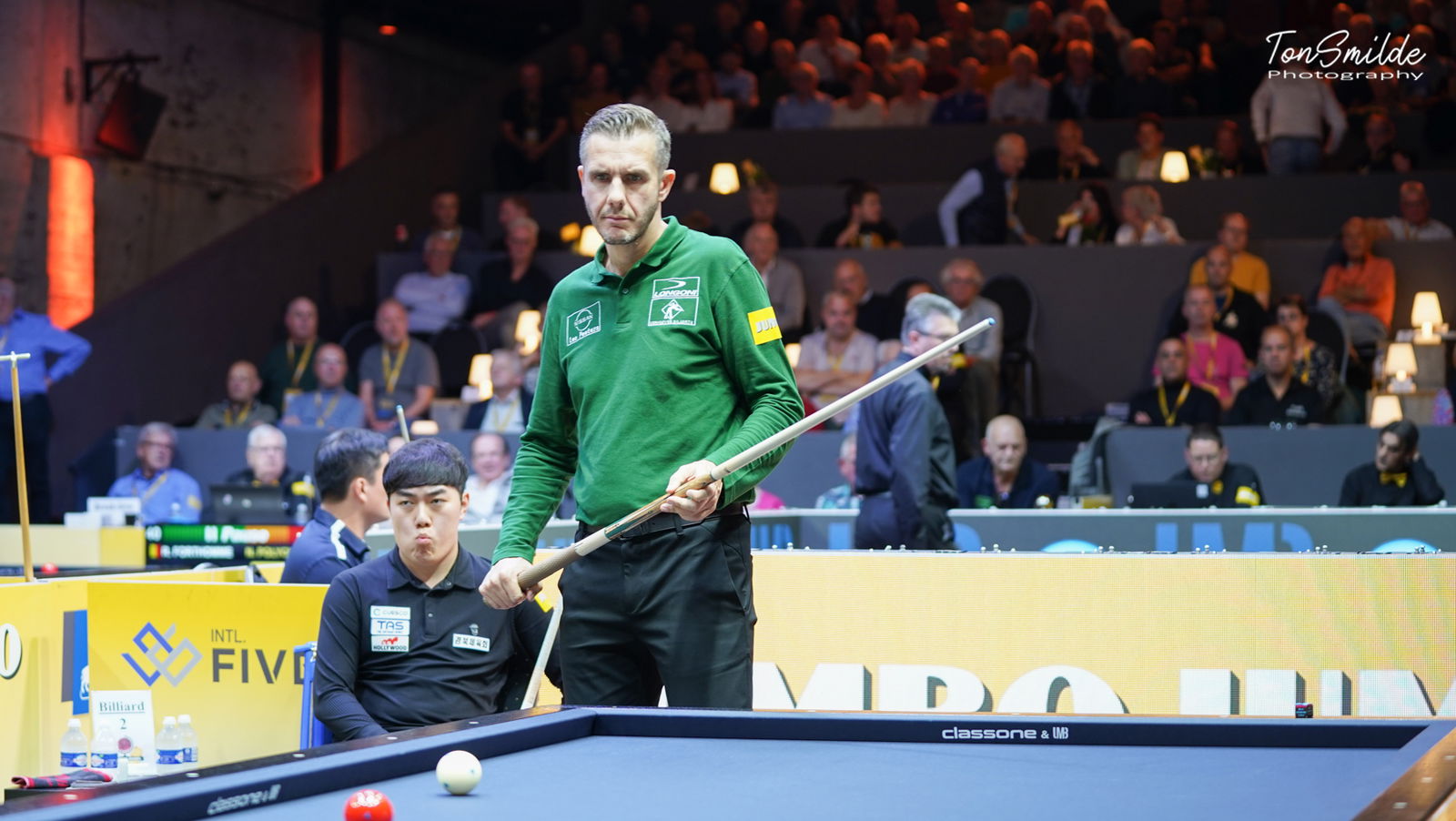 Peter Ceulemans gagne le tirage à la bande et sort des startings-blocks face à Jun-tae Kim avec 15-1-7 pour mener 23-14 en 3 reprises. Le Coréen reviendra à 5 points mais Peter Ceulemans tient bon et s’impose 50-44 en 25/24 reprises.