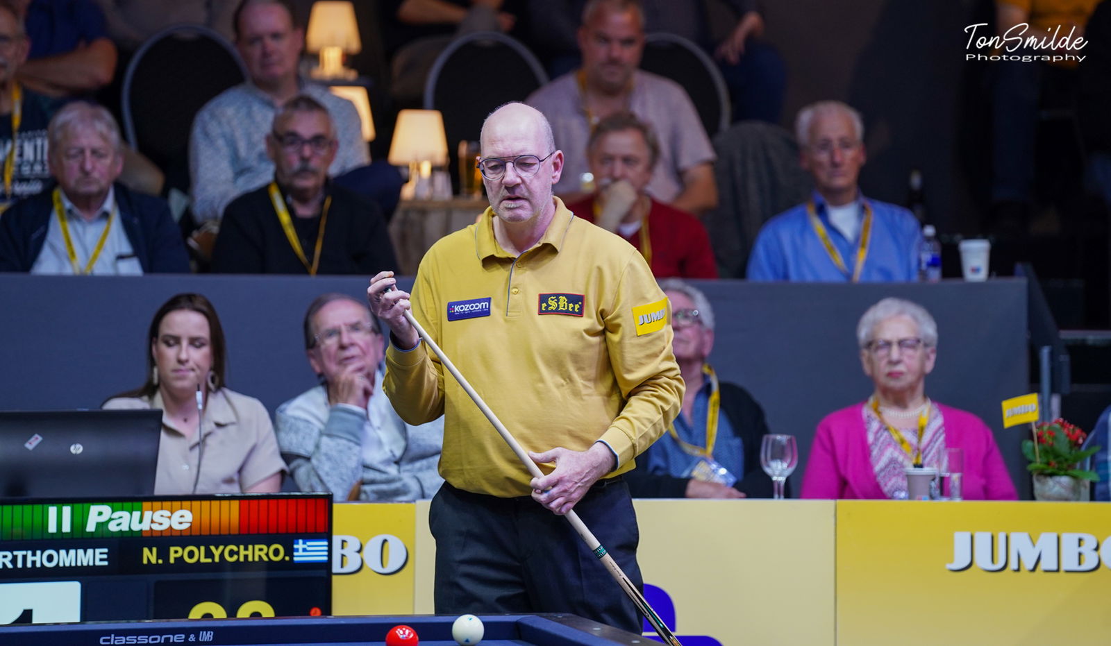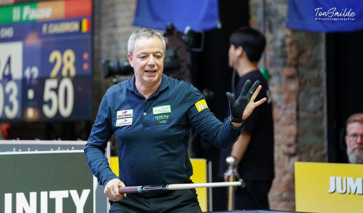 Aujourd’hui, Caudron n’avait pas la tâche facile. En huitième de finale, il affrontait Myung-woo Cho, Champion du monde en titre pour l’une des plus belles affiches que le 3 Bandes puisse proposer. Le jeune Coréen de 26 ans démarre bien et mène 17-5 en 5 reprises. La réaction du Belge ne se fait pas attendre et il marquera 45 points sur les 13 reprises suivantes et pas une reprise à vide : 50-37 en 18 reprises soit le 2ème meilleur match de ces huitièmes.