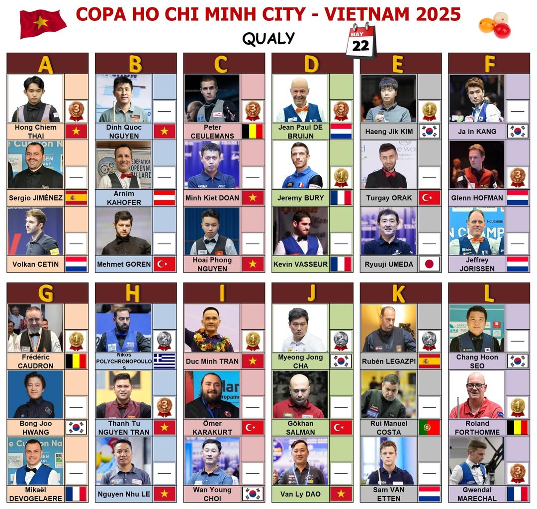 Maxime Panaia et Pierre Soumagne n’ont guère pu s’exprimer avec deux défaites chacun. Parmi les autres qualifiés, soulignons la belle performance de Sam Van Etten (MG 1,750) avec 35-18 en 19 reprises contre Maxime Panaia et 35-30 en 21 reprises face à Long Nguyen Chi. Celles de Dao Van Ly à 1,590 de moyenne (aux dépens de Son J.H et Truong Q.H auteur d’une série de 14, tous les trois entre 1,500 et 1,600 de moyenne), de Choi Wan-young à 1,521, de Nguyen Nhu Le à 1,521, de Kang Ja-in à 1,346, de Ryuuji Umeda à 1,320, de Nguyen Hoai Phong à 1,186 (aux dépens de Kostistansky et Novak), Mehmet Gören à 1,129, de Volkan Cetin à 1,029, de Sergio Jimenez à 1,372, d’Arnim Kahofer à 1,272 (aux dépens de Uymaz), de Doan Minh Kiet à 1,512 et de Jean Paul de Bruijn à 1,486.