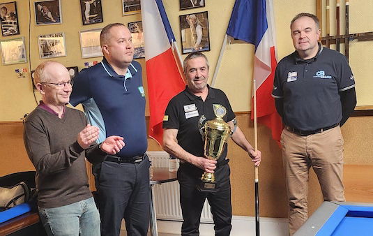 Bernard Villiers (Ronchin) remporte le 3ème et dernier tournoi national de la saison 2022/2023 à la Bande à Chartres ce week-end lors d’une superbe finale contre Xavier Le Roy (Marines). Ce dernier boucle les 120 points à la 8ème reprise laissant Villiers à 77 avec reprise à suivre. Villiers, fidèle à sa réputation, réussira à égaliser sur une série de 43 pour ensuite s’imposer 2-1 en prolongation. Il était mené 36-102 à la 5ème reprise de ce match (série 62 pour Le Roy). Villiers termine la distance sur 40-1-43.