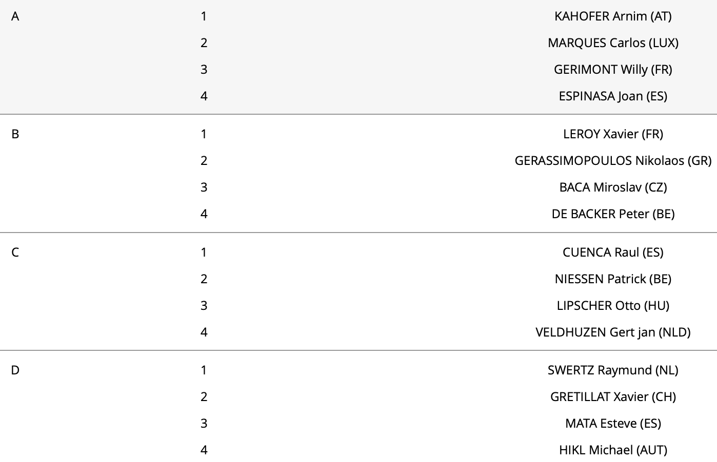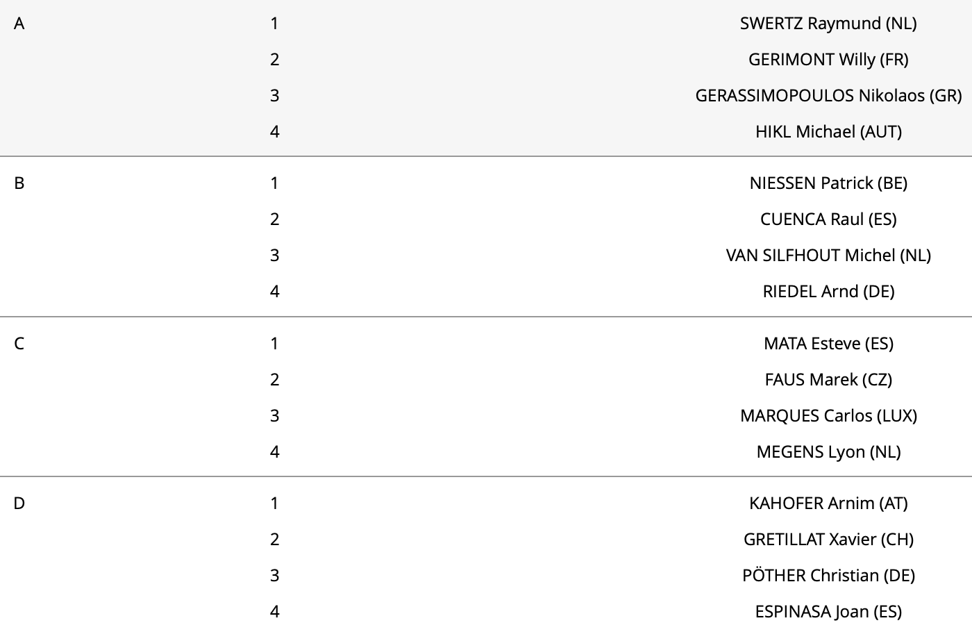 La France notamment n’aura qu’un représentant aux cadres (Willy Gérimont) probablement en raison du forfait de Jean-François Florent à qui l'on pense bien fort et deux à la Bande (Xavier Le Roy et Willy Gérimont). Qu’elle est loin l’époque des CMT (Classic Masters Trophy) s’étalant sur une semaine par mode de jeu et regroupant tous les joueurs qui souhaitaient s’inscrire, sur le type de formule des World Cups, par incrémentation !