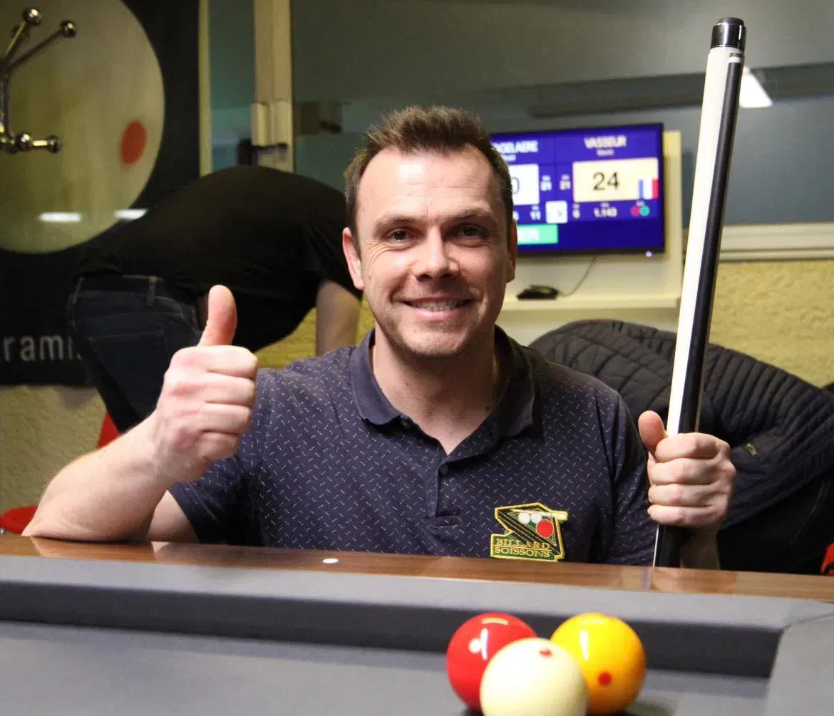 Mikaël Devogelaere : Avec Soissons, nous sommes parmi les plus grands clubs de France, en tout cas sur le plan sportif. Le club est situé dans un gymnase, un club magnifique avec 9 tables de billard dont 3 tables de match. Nous jouons nos matchs pour la D1 devant une centaine de spectateurs. Seul le billard carambole est pratiqué à Soissons, toutes disciplines confondues.