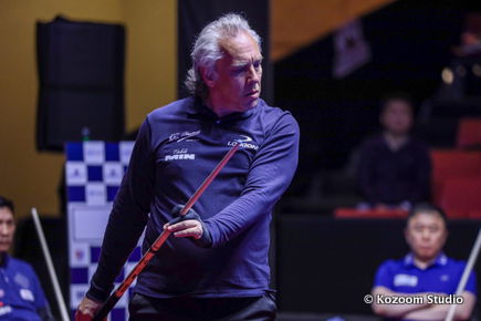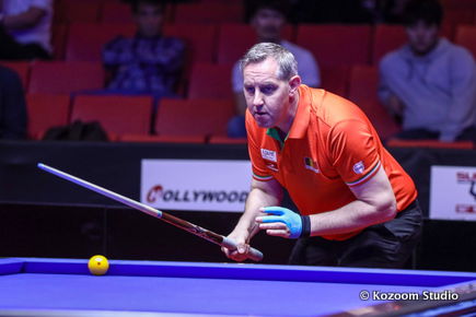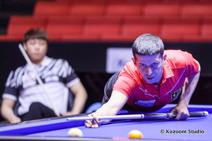 Murat Naci Coklu attaque d’entrée avec 7 et 11 aux deuxième et troisième reprises et marquera encore 7 avant la fin de la première session de 45 minutes. Le Turc terminera la rencontre avec le plus grand total (153 points) sur l’ensemble des 6 rencontres. Sung-Won Choi prend la deuxième position et Tran Quyet Chien, nouveau Champion d’Asie, marque 5 reprises à vide sur les 6 dernières du match. Coklu est à 3,266 de moyenne, Choi à 1,466, Tran à 1,133 et WY Choi à 1,000.