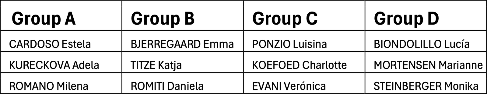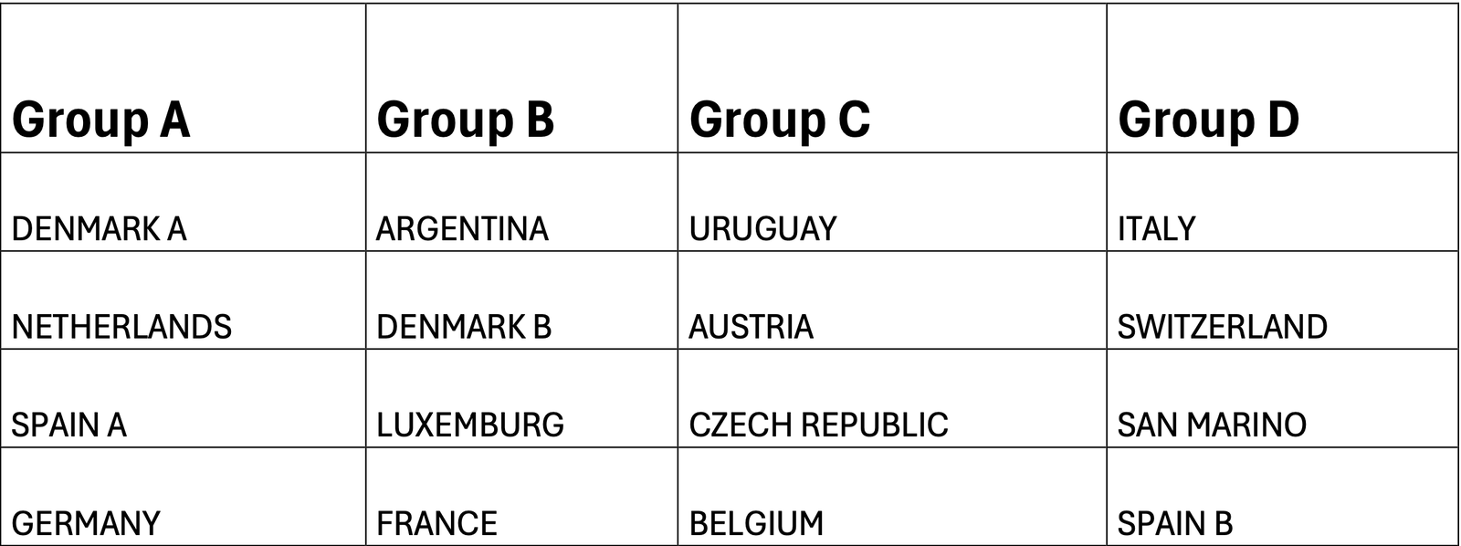 16 équipes dont une équipe française seront réparties en 4 groupes dont voici la composition :