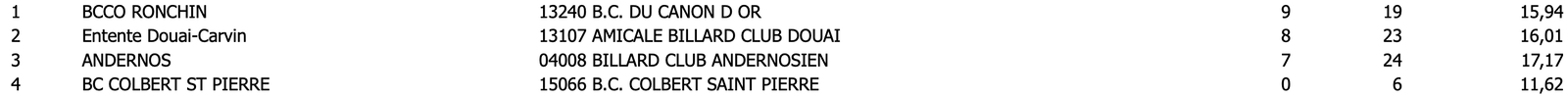 Pierre Martory bat Ludovic Hébrard 250-91 en 7 reprises ce qui lui donne une moyenne sur deux matchs de 45,45. Michel Van Silfhout bat Jordan Aubert 200-128 en 7 reprises et donc une générale pour le Néerlandais au grand cadre de 50,00. Johann Petit bat Léo Dubernet 120-42 en 12 reprises et 7,17 pour le capitaine osselien ce week-end.