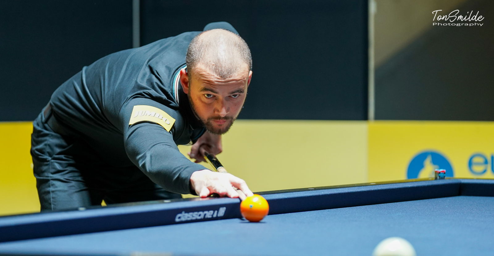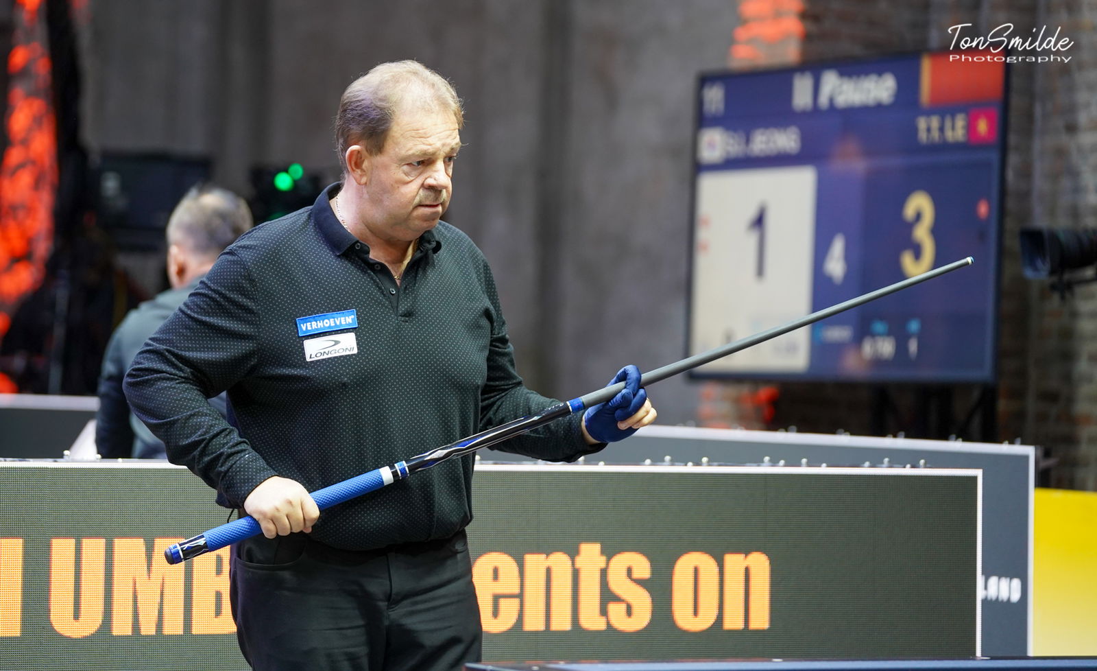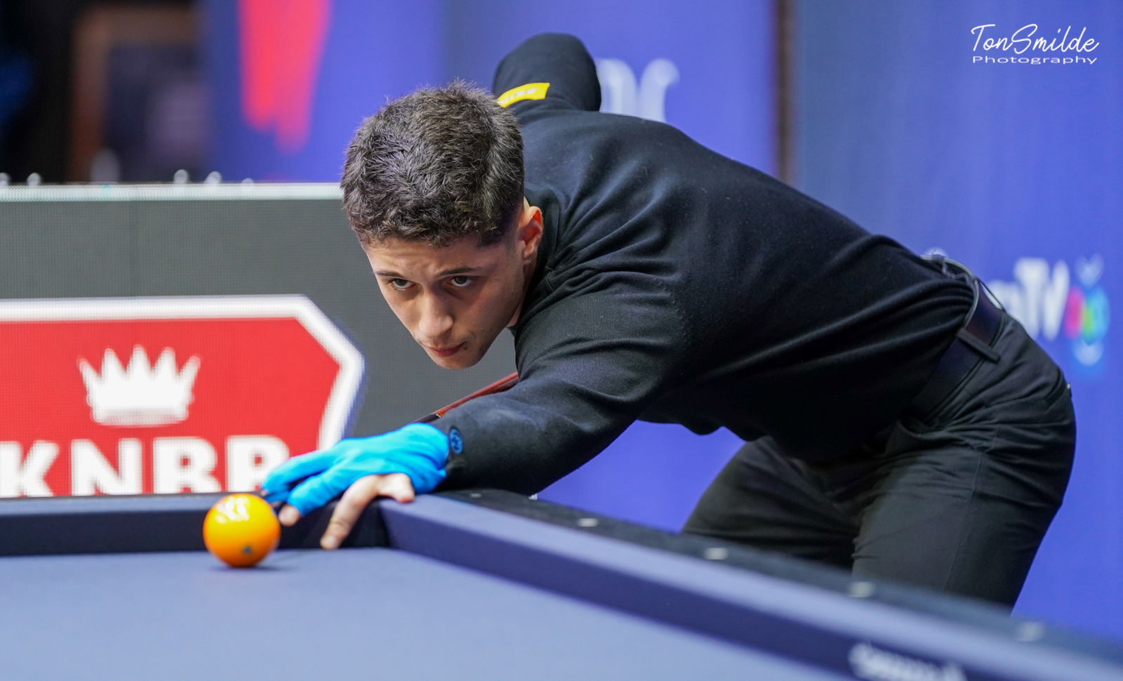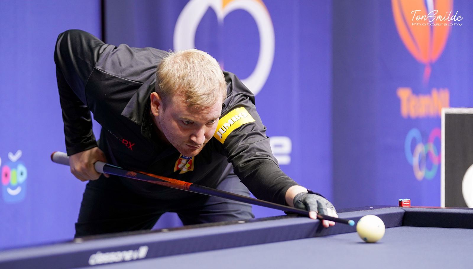 Peter de Backer (MG 1,682) frappe d’entrée contre David Pennör 35-17 en 14 reprises puis le Suédois devance Muammer Rahmet 35-34 en 30 reprises. Pas grand chose à craindre pour De Backer ensuite contre le joueur turc, il s’incline 34-35 en 27 mais se qualifie en triangulaire.