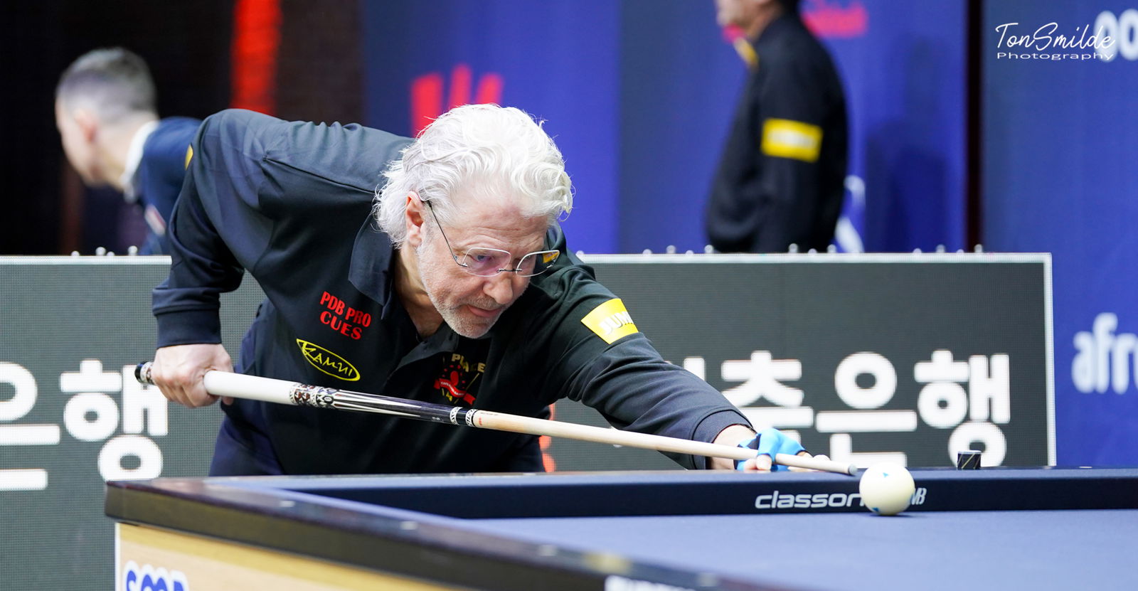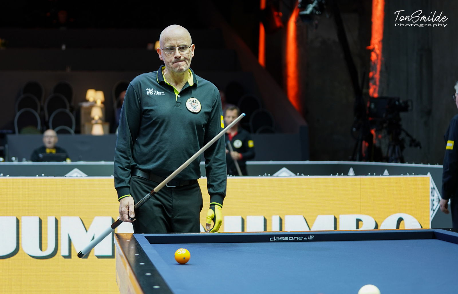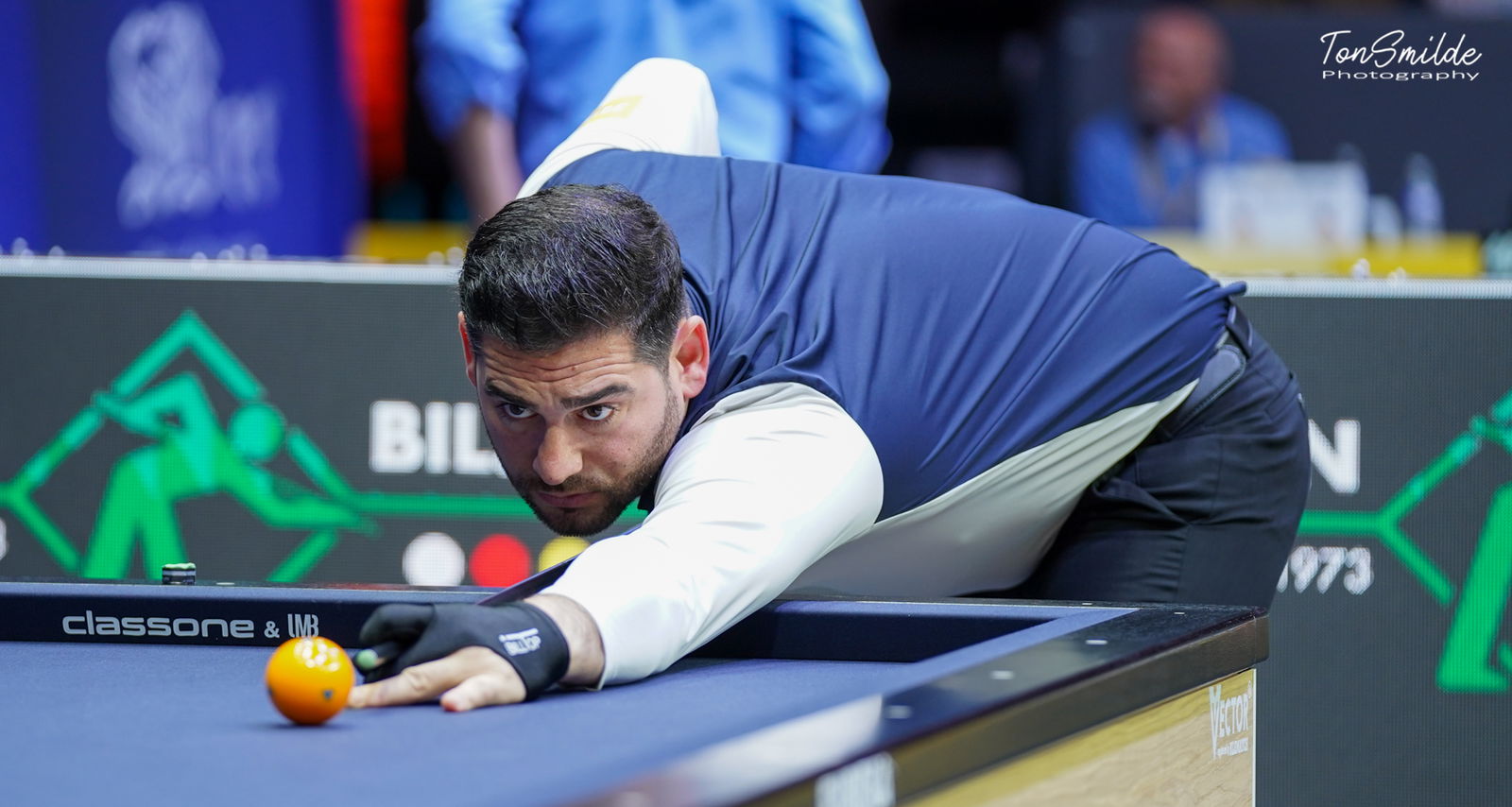 Brian Knudsen (MG 1,521) est dans la continuité de son beau championnat du monde, 35 points en 23 reprises par deux fois contre Alain Saeijs et Lukas Stamm qui ne marquent que 11 et 15 points, journée paisible pour le Danois ! Ce sera moins paisible demain face à Ruben Legazpi et Frédéric Caudron…