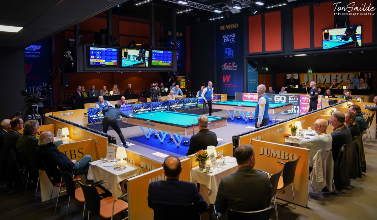 BERLICUM - De rangen en standen zijn weer hersteld op de Jumbo Masters in het Beneluxtheater in Berlicum. Het Nederlands kampioenschap driebanden gaat de finaleronden zaterdag en zondag tegemoet met Dick Jaspers als topfavoriet, Jean Paul de Bruijn als titelhouder, Barry van Beers als held van de laatste kwalificaties, Dave Christiani en Raimond Burgman als spelers met de maximale scores in matchpunten en Barry van Beers als hoogste in moyenne met 1.953 voor Jaspers met 1.836, Hofman met 1.529 en Christiani met 1.520. Voor de knock-outs van zaterdag, die op 1 tafel worden gespeeld, ontbreken Jean van Erp en Jeffrey Jorissen. Het speelschema staat voor 12.30, 14.30, 16.30 en 18.30, waarna zondag de halve finales en finale worden gespeeld.