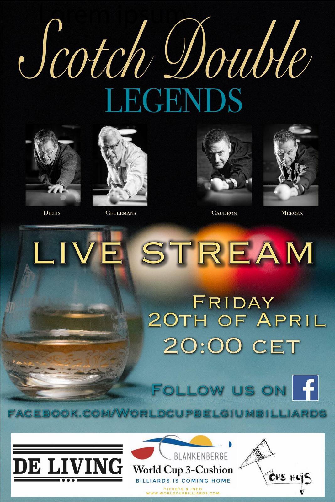 De vier grootmeesters trappen vanavond af in een demonstratie Scotch Double in een ludieke wedstrijd tussen de twee generaties. Kurt Ceulemans, de organisator van de World Cup, spreekt van een generatieclash met een knipoog naar het gebeuren aan de kust. Er wordt gespeeld in lokaal Ons Huis, Geluwestraat 1 in Berchem, waar de Antwerpse Drieband Liga de scepter zwaait. Team De Living biedt de helpende hand bij de organisatie.