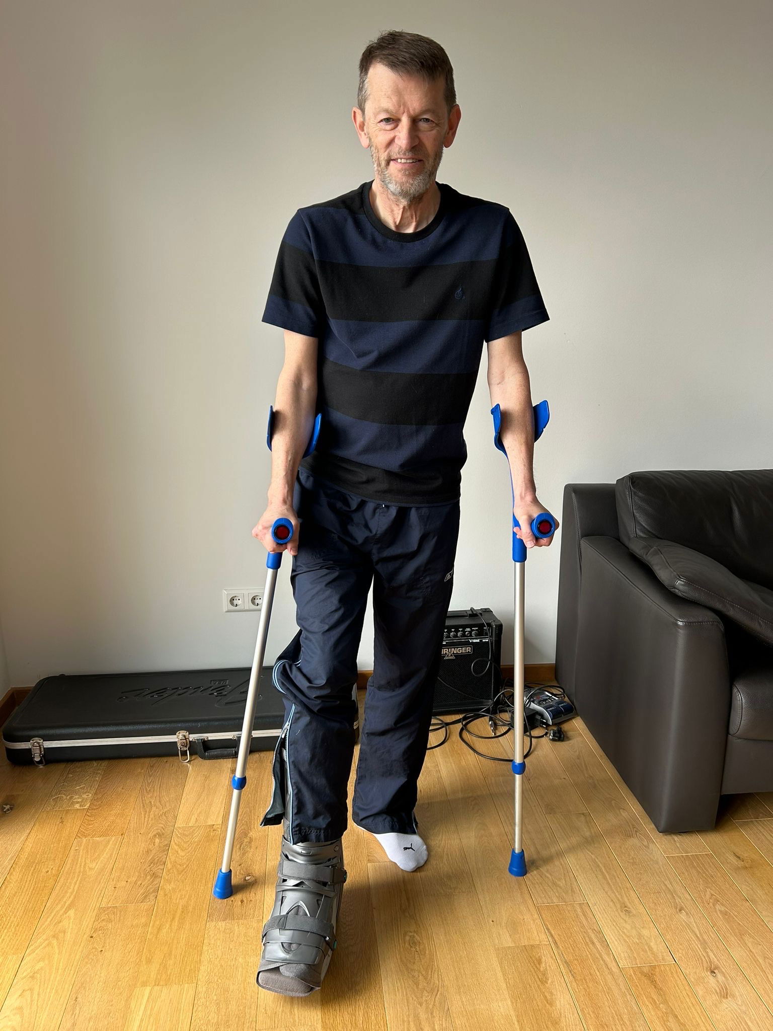 Torbjörn met zijn ingepakte rechter voet en op krukken (foto Henrik Blomdahl)