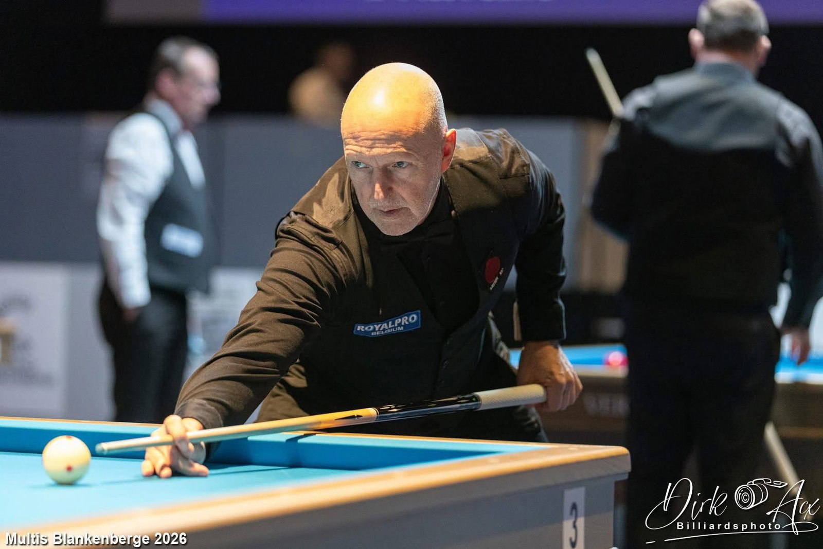 Het hoogtepunt van de donderdag in De Carambole in Rumpt lag natuurlijk op de sessie met Peter Ceulemans, de nieuwe Europese kampioen en zijn oom Kurt, de organisator van zo veel mooie toernooien. Tom Persyn en Ronny Brants, de twee verschrikte tegenstanders stonden erbij en keken ernaar in de galavoorstellingen van de Ceulemansen. Kurt startte met 15-8 in 6 en 15-2 in 6. Peter in zijn partij tegen Brants ging met 15-11 in 8 van acquit en finishte met 15-6 in 4. Peter schitterde met een 9, Kurt met een 8 voor de Eekhoornboys.