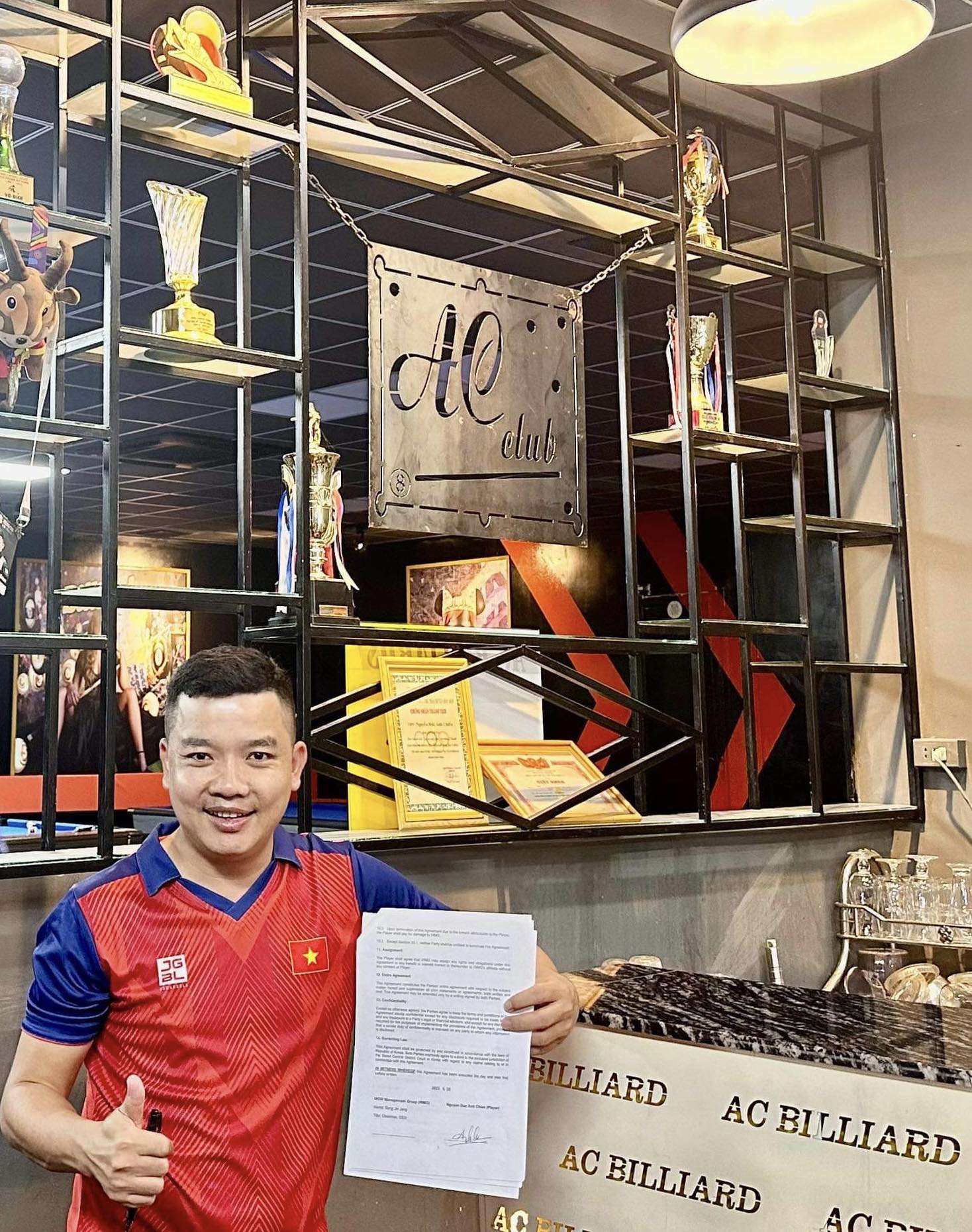 Duc Anh Chien Nguyen tekent in zijn eigen biljartclub het driejarig contract met de PBA
