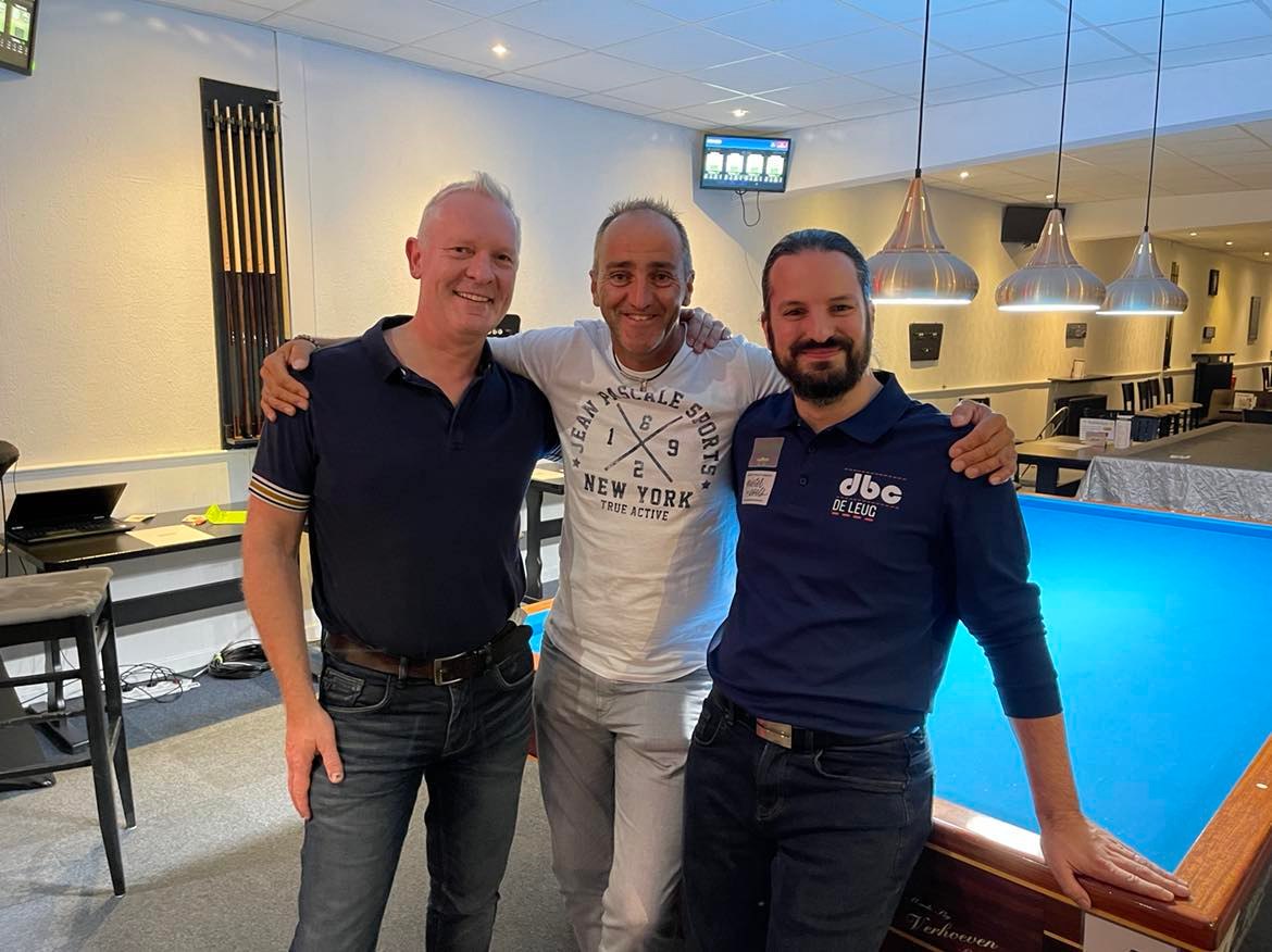 De organisatoren Mik Durwael en Tim Gorrebeeck met sponsor Marc Verhoeven (midden) van Biljartdin