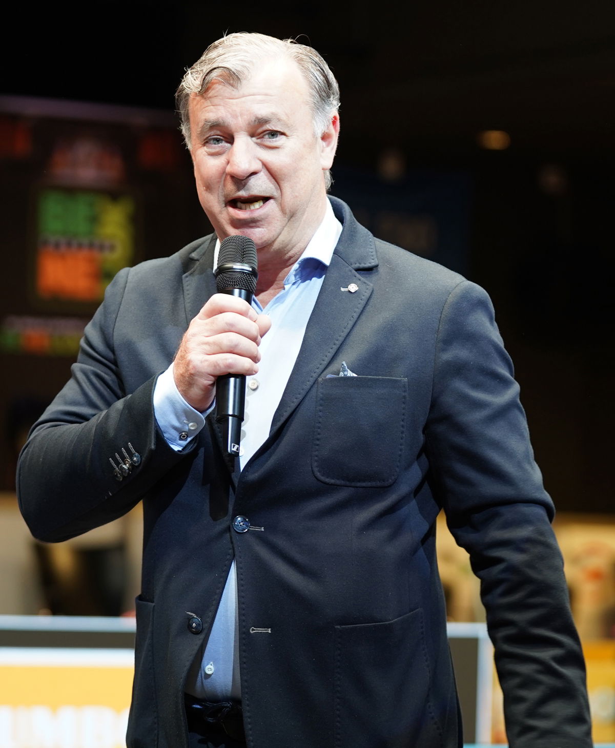 Harry Mathijssen in een rol die hem op het lijf is geschreven: als entertainer in de arena van zijn World Cup