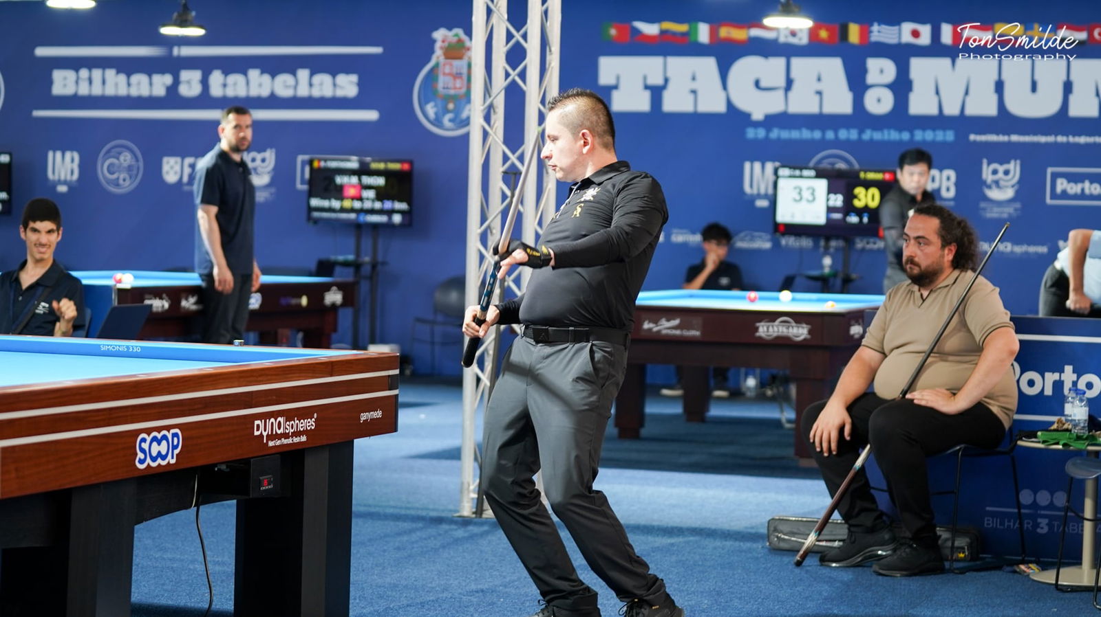 PORTO – De boomlange Turk Emrullah Basegmez was net iets sneller aan de finish dan Frédéric Caudron en Glenn Hofman, de eerste spelers op woensdagavond die zich kwalificeerden voor het hoofdtoernooi van de World Cup in Porto. Daarna in volgorde van opkomst en hoge moyennes kwamen onder andere Peter Ceulemans, Nick Polychronopoulos, Peter Ceulemans en Jérémy Bury, later in de avond bovenal gevolgd door Viet Hoang Minh Thon, de absoluut beste speler van deze dag. De hoogste moyennes van de dag waren voor Thon met 4 punten en 2.000, Caudron met 4 punten en 1.951, Hofman met 2 punten en 1.975 en Salman met 2 punten en 1.780.