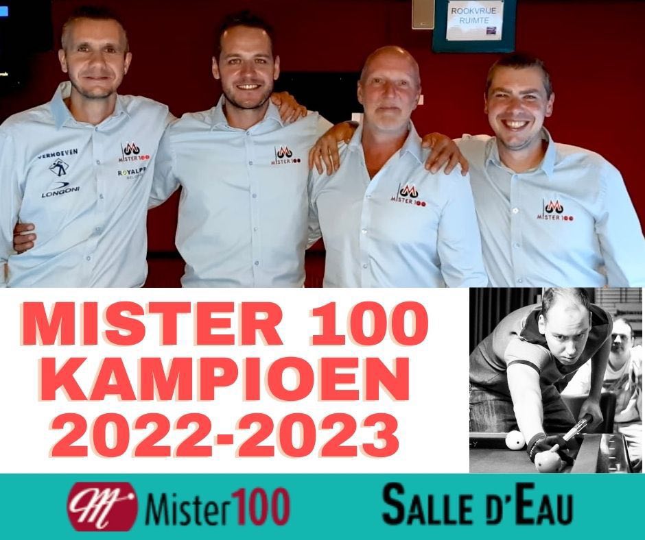 LIER – De Mister 100, genoemd naar de grootste kampioen aller tijd, heeft de Belgische titel voor teams behaald met 35 punten uit 22 wedstrijden. De voorsprong op Den Eik, de nummer twee, bedraagt aan het eind van de competitie 4 punten. De kopman van Mister 100, Peter Ceulemans, was de grootverdiener voor zijn team met 32 matchpunten uit 22 partijen voor Barry van Beers met 31 uit 21 en Frédéric Mottet met 30 uit 20. Eddy Merckx heeft het hoogste gemiddelde met 1.771 in 16 partijen voor Frans van Kuyk met 1.605 in 19, Peter Ceulemans met 1.552 in 22, Roland Forthomme met 1.542 in 21 en Barry van Beers met 1.539 in 21. De hoogste serie staat op naam van Frans van Kuyk met 21 voor Jean van Erp met 20.