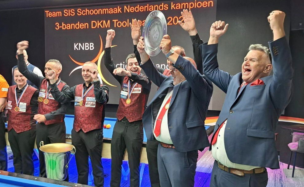 UDEN – De climax in de strijd om het Nederlands kampioenschap voor teams, aan het slot van de play-offs, hield de zaal van SIS biljartcentrum tot het laatste moment in spanning. De immense beker voor de Nederlandse kampioen teams verdween uiteindelijk na een hard en fair gevecht toch weer in de prijzenkast van het topteam van SIS Schoonmaak. De tweekamp tegen STZ Zundert, die pas werd beslist over drie wedstrijden, bleef enerverend tot de laatste caramboles. Twee teams vochten met voortdurend en om beurten wisselende kansen om het zo begeerde kampioenschap. De overwinning van de routinier Raimond Burgman tegen de jonge Noord-Hollander Sam van Etten bleek goud waard voor SIS Schoonmaak. Carl Verhoeven, de teambaas, kon een klein uurtje later de grote beker omhoogsteken te midden van zijn spelers. De sponsor en teameigenaar had zelf als tijdelijk keukenchef een drukke dag, kon zijn spelers nauwelijks aanmoedigen, maar kon toch uitbundig juichen nadat de klus tenslotte nog was geklaard.