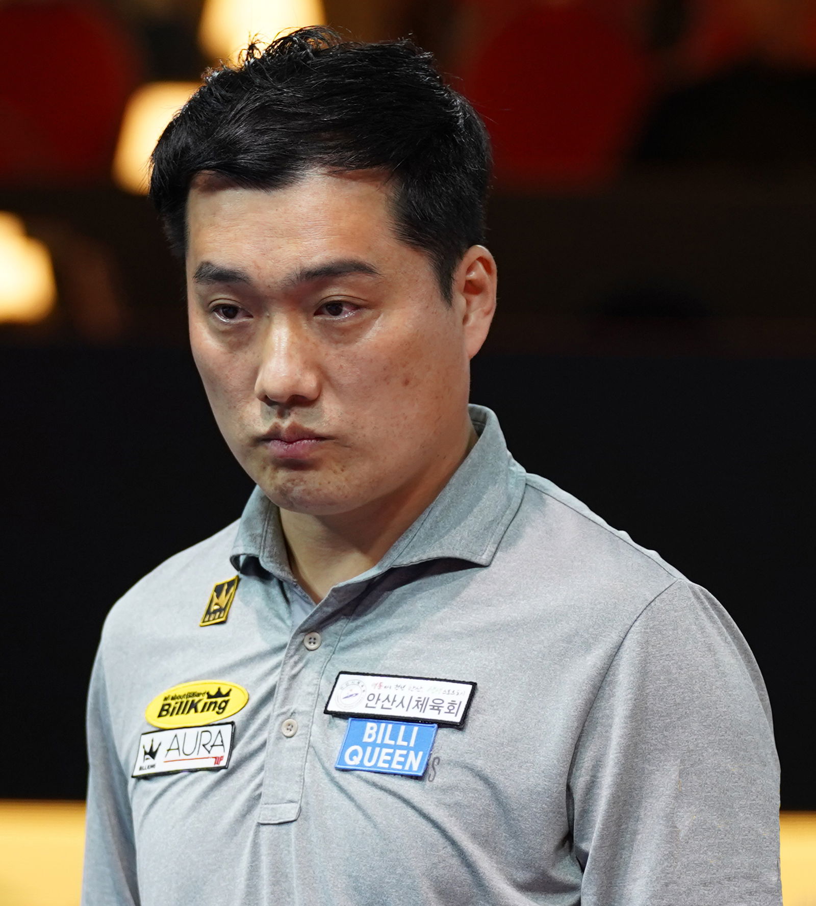 Myeong Jong Cha zorgt voor de sensatie in zijn partij tegen zijn illustere landgenoot Haeng Jik Kim. Het wordt een taaie partij tussen de twee landgenoten, die in series allebei niet boven de 5 komen. Cha is de beste starter met 14-7 in 10, waarna Kim blijft tobben en met 34-29 de finale ingaat. Op 45-35 gaat Cha uit met 2 en 5