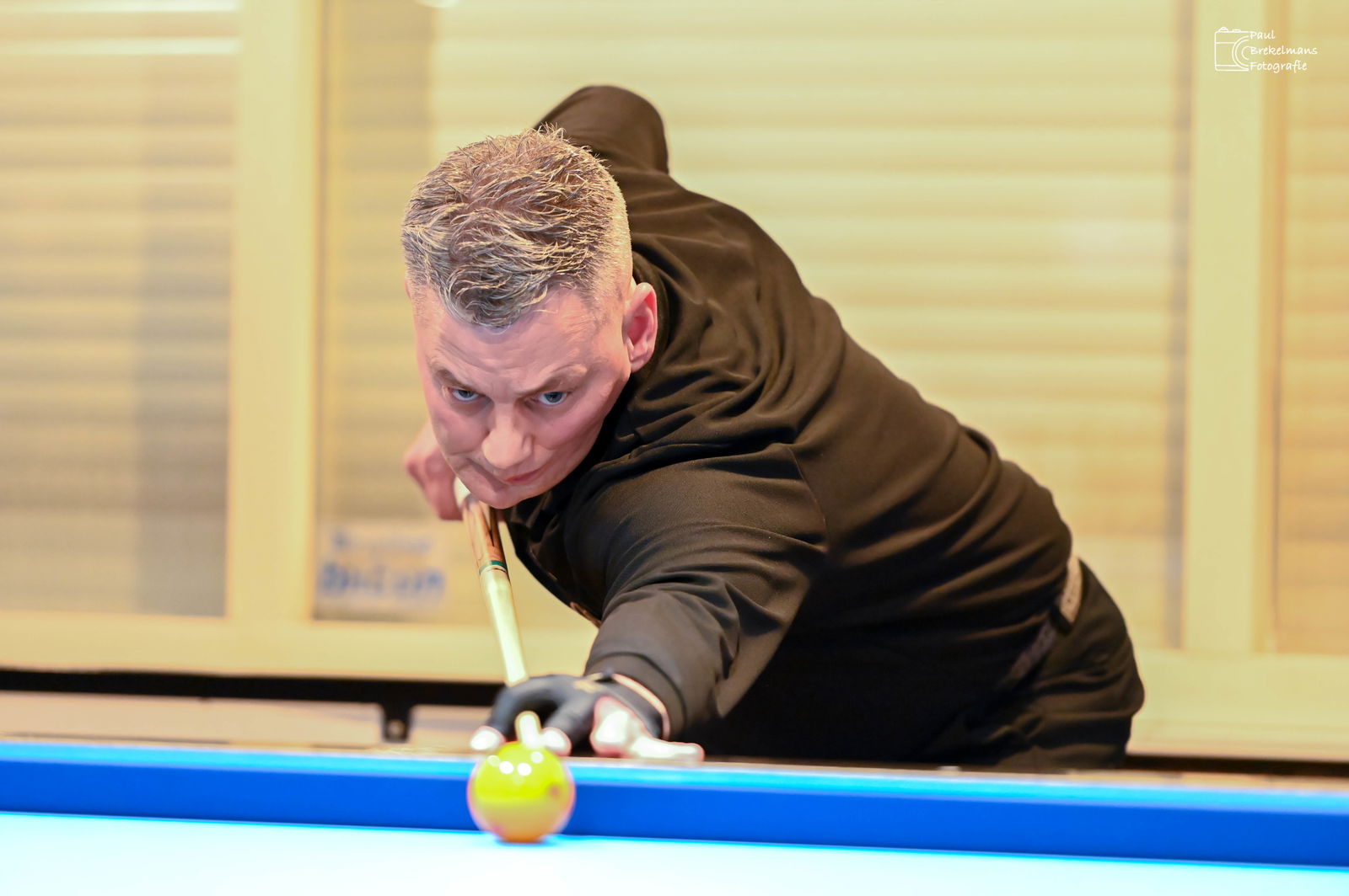 Michael Vink, ongeslagen poulewinnaar met overwinningen op Paul Bruijstens, Riny Zwiers en Rudy Gerritsen, is terug na een paar tamme jaren op het biljart. ,,Ik had een goede dag vrijdag, dat viel niet tegen na bijna 2 maanden geen biljart. De competitie lag stil en trainen is moeilijk.'' De Zeeuw heeft zijn ambitie terug, nadat hij in een vorige periode vier jaar les heeft gehad van Jean Paul de Bruijn. ,,Het was de laatste twee, drie jaar wat lastiger om me verder te ontwikkelen: eigen woning, vast werk en dan komt biljarten wat op de achtergrond. Maar ik probeer het nu weer op te pakken. En in mijn volgende woning wil ik een biljart zetten, dan zie ik wel waar het strandt.''