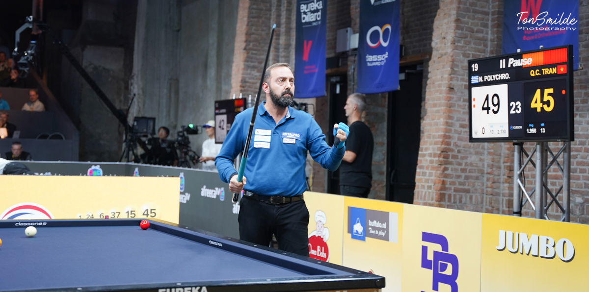 De partij wordt op gang geschoten door de kleine Tran, die met een serie van 13 in de 15e beurt de leiding neemt met 31-24. De Griek, van de superserie van 25 op de vorige dag, krijgt plotseling vleugels, scoort 5, nog eens 5 en 13, waarmee hij op 1 punt van de finish komt (49-43). Het duurt nog drie beurten voordat de winst binnen is, Tran blijft op 45.