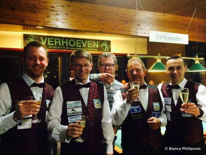 ,,We hebben er een pintje op gedronken'', zei Dielis. ,,Misschien dat we het over een paar weken nog eens vieren in ons eigen biljartlokaal in Merksem.'' Jean van Erp: ,,Het is hooguit een bescheiden feestje, maar blij zijn we wel.'' Ludo Dielis: ,,We gingen er al vier, vijf weken vanuit dat we tweede zouden worden. Maar dat veranderde op slag, omdat De Goeie Queue onverwacht de koppositie weggaf. Wij hebben geprofiteerd, hoewel we het vanavond op de slotdag ook even moeilijk hadden.''