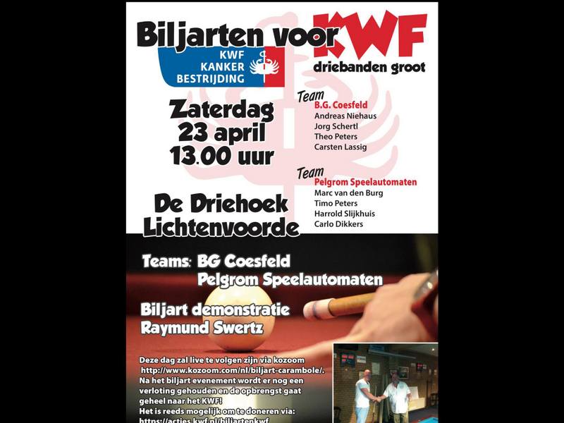 LICHTENVOORDE - Het initiatief kwam vorig jaar van Timo Peters: een biljarttweekamp organiseren en verbinden aan een goed doel: de KWF kankerbestrijding. De eerste editie werd een succes en krijgt volgende week, op zaterdag 23 april, een vervolg. De plaats van handeling: De Driehoek in Lichtenvoorde. Twee teams spelen tegen elkaar, Pelgrom Speelautomaten en BG Coesfeld uit de tweede bundesliga.