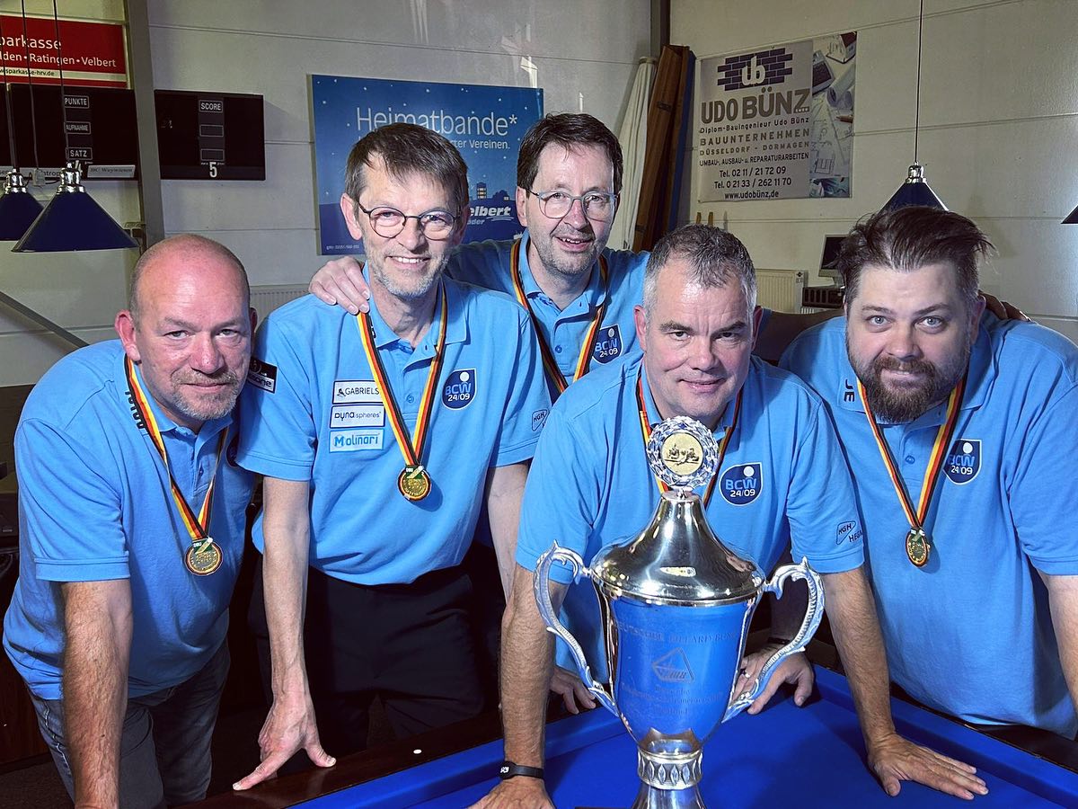 VELBERT - De regerend Duits kampioenen BC Weywiesen uit Bottrop heeft in Velbert de Duitse beker gewonnen en is dus officieel de dubbele winnaar. Het team greep in het afgelopen seizoen ook de Duitse titel driebanden voor teams. Het team bestond uit Torbjörn Blomdahl, Christian Rudolph, Markus Doemer, Jens Eggers en Markus Wirgs (coach).
