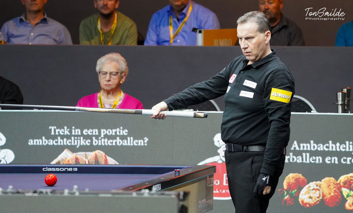 VEGHEL – De World Cup in Veghel krijgt vandaag (zaterdag) een podium met twee Nederlanders, de Belg Eddy Merckx en de Duitser Martin Horn. De Europeanen domineren de finalefase in de biljartarena in de Hollandse enclave met tjokvolle tribunes, waar Dick Jaspers en Jean Paul de Bruijn, twee jarenlange vrienden, tegenover elkaar staan en Eddy Merckx strijdt met Martin Horn voor de andere finaleplaats. De toppositie op de wereldranglijst staat op het spel: Eddy Merckx moet het toernooi winnen om de positie van Marco Zanetti over te nemen. De Koreaan Myung Woo Cho, die al is uitgeschakeld, is de andere kanshebber.