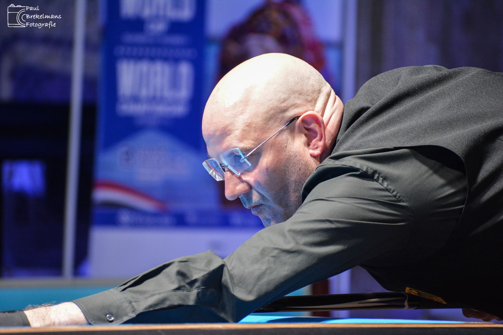 Het mooiste slot in de vroege sessie op zaterdag kwam van Nikos Polychronopoulos en Jun Tae Kim. Het liet nog maar eens zien wat pressie en zenuwen met een speler van deze klasse kunnen doen. De Griek, niet zo best gestart met 2 in 5, kwam in de partij in de fase rond de 16e beurt met serietjes van 8 en 6 (32-32), kwam toch weer achter met 46-37, maar leek toen in een prachtige flits van zijn snelle scoringsdrift naar het einde te gaan. De serie van 12 was geweldig, alleen kwam ’de 13’ voor de winst niet uit zijn keu. Hij miste op 1 carambole. Kim kwam met 3 ook op 49, Polychronopoulos miste nog een maakbare matchbal en zag Kim finishten op 50-49 in 27.