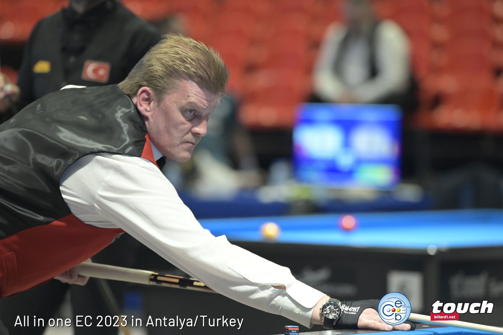 ANTALYA – Twee grote kampioenen, pas nog gekroond tot beste van de wereld met Turkije, zijn onverwacht uitgeschakeld op het Europees kampioenschap in Antalya. Tayfun Tasdemir en Semih Sayginer doen niet meer mee voor de hoofdprijzen na verlies tegen Thomas Andersen en Eddy Merckx. Twee andere grote kampioenen hadden een prachtige eindsprint nodig om te overleven: de Spaanse titelverdediger Dani Sánchez tegen zijn landgenoot Ruben Legazpi, de nummer één van de wereld, Dick Jaspers, tegen zijn landgenoot Jean Paul de Bruijn.