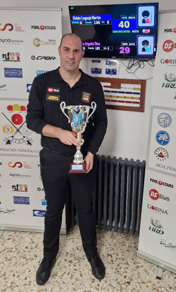 ZARAGOZA – Ruben Legazpi heeft in Zaragoze de derde Grand Prix gewonnen van dit Spaanse seizoen. In de finale versloeg hij Carlos Anguita met 40-29 in 16 beurten. Het slot van Legazpi was fameus: hij won de halve finale tegen Jordi Garriga met 40-10 in 13 beurten (series van 9 en 10) en de kwartfinale tegen Joseba Escribano met 40-20 in 20 (start met 0, 9 en 16). De laatste 120 caramboles gingen in 49 beurten, 2.448 gemiddeld.