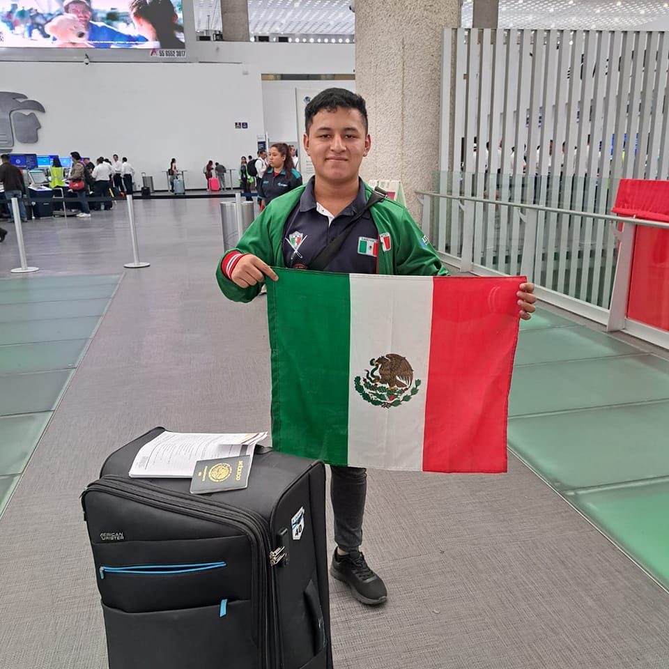 De 15-jarige Mexicaan Ubaldo Sanchez poseert op het WK met de vlag van zijn land
