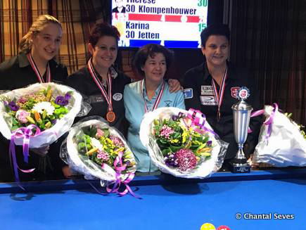 Therese Klompenhouwer haalde de 1.000 gemiddeld niet op zaterdag, maar was zondag tegen Daisy Werdekker (30-10 in 18) en in de finale tegen Karina Jetten (30-15 in 26) veel beter op dreef. ,,We bleven in de finale gelijk gaan tot 11-11, daarna liep ik met kleine serietjes uit.'' Karina, na een mooie start van het toernooi, scoorde bijna niet meer in het tweede part van de finale, zodat ze toch weer kansloos was.