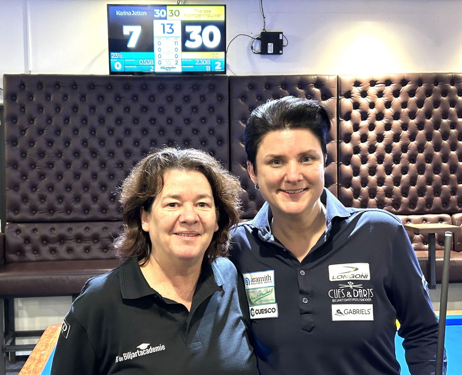 De Grand Prix in Sittard was de zesde in totaal in Nederland. Therese won ze allemaal. De Blaricumse kampioene is al die jaren superieur in de ontmoetingen met andere Nederlandse dames in driebanden. Karina Jetten schitterde dit jaar vooral internationaal. In de finale tegen Therese kreeg ze dit keer geen schijn van kans. Karina Jetten won in de halve finale van Monique van Exter met 30-17 in 41.