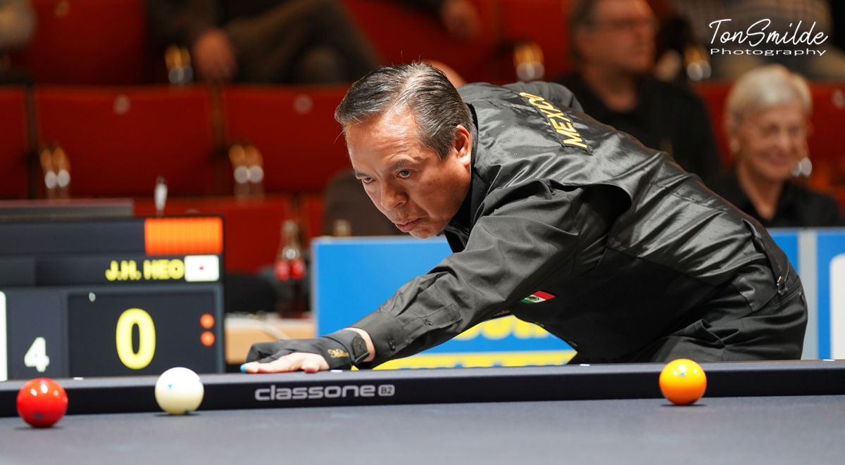 De Koreanen startten hun missie met een totaal onverwachte verliespartij tegen Mexico (0-4), dat zich met Duitsland (4-0 winst tegen Egypte) op de eerste plaats meldde na de eerste dag. Haeng Jik Kim, die zo sterk uit de World Cup van Las Vegas kwam, had een totale off-day tegen Christian Hernandez. De Mexicaan greep zijn kans in de fase waarin zijn Koreaanse tegenstander negen keer miste in zijn laatste 13 beurten. Hernandez werkte eerst een achterstand weg en ging door de finish met 4, 2 en 1 voor een eindstand van 40-38 in 27. Javier Vera kreeg op de andere tafel ook al een onherkenbare Koreaan tegenover zich. Jung Han Heo startte met 5 nullen, maakte toen een 9 en in de slotfase een 8, maar toen was Hernandez, die na 12-0 met regelmaat bleef scoren, al ver genoeg om de winst te grijpen met 40-34 in 29.