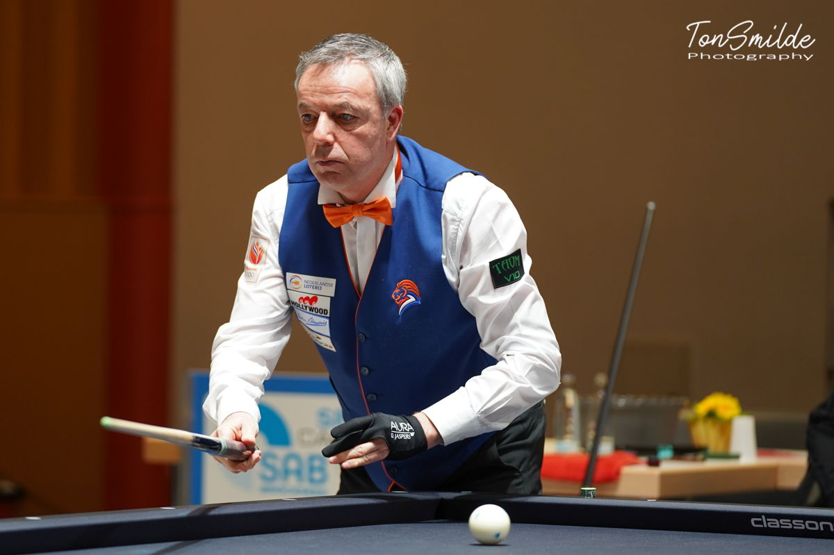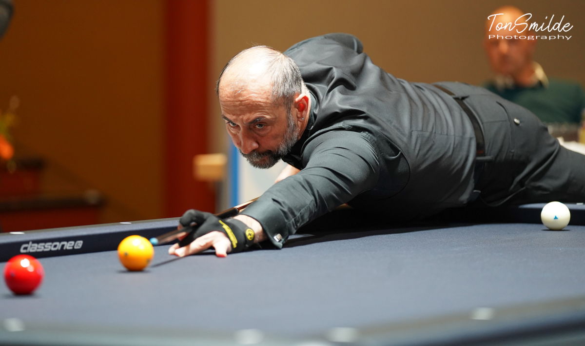 De Turkse zege in Poule A tegen het kansloze USA team was indrukwekkend. Vooral Semih Sayginer speelde een prachtige openingspartij tegen Hugo Patino. Door een serie van 16 in de 8e beurt, de op een na hoogste van deze dag, kwam Sayginer op een marge van 27-5. Die voorsprong gaf hij niet meer weg: het werd 40-11 in 17 beurten. Tayfun Tasdemir had iets meer werk met Carlos Mario Villegas, ook met een riante score: 40-17 in 24. Daardoor gaan de Turken fier aan kop in deze Poule A, waar Japan en Griekenland met een gelijke score eindigden. Nikos Polychronopoulos had in die wedstrijd weinig moeite met de ex-wereldkampioen Ryuuji Umeda, die hij versloeg met 40-17 in 24 beurten, maar de andere Japanner, Takao Myashita, toonde zijn kwaliteiten en rekende af met de Griek Kostas Anonatos met 40-19 in 23. Dat brengt de Turkse titelverdediger na één dag dus aan kop met de maximale matchpunten, Japan en Griekenland volgen op 1 punt. Turkije treft vrijdag eerst Griekenland, onder andere met de partij tussen Semih Sayginer en Nikos Polychronopoulos om 16.00 uur.